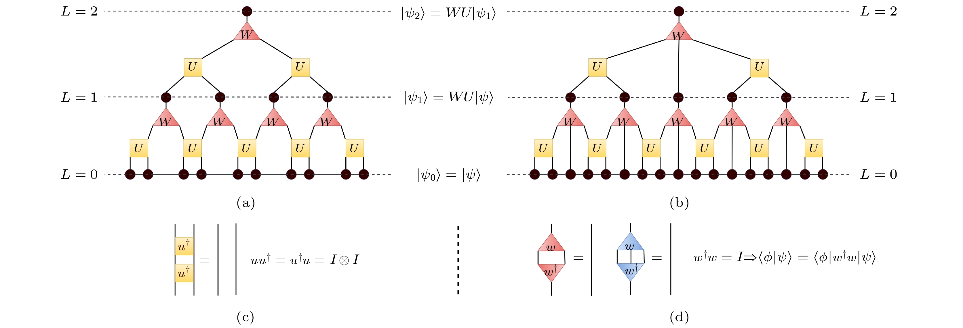 MERA是一种层次化的张量网络结构(如图1所示), 由一系列的等距映射算符W和解纠缠算符U组成. W用于降低系统的自由度, 而U则用于消除局部纠缠. 这种结构使得在计算物理量时能够减少计算复杂度, 同时保留系统的关键纠缠信息.