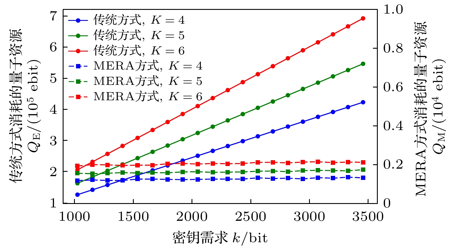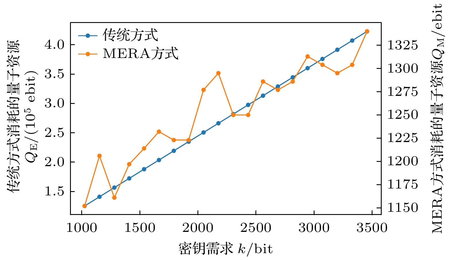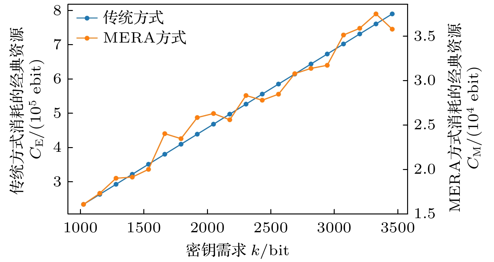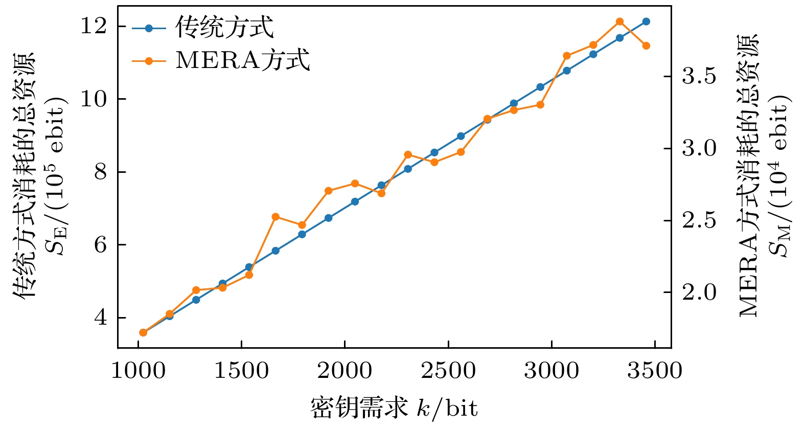 图9展示了量子资源和经典资源总和的变化趋势, 随着需求量的增加, 总资源消耗逐渐上升. 然而, 传统方式的资源消耗增长速度远高于MERA方式. 这主要是因为传统方式的密钥生成直接依赖于大量纠缠资源, 而MERA方式对纠缠资源的需求较弱, 因此其资源消耗增长较为缓慢. 由此可见, MERA方式在资源消耗方面具有显著优势.
