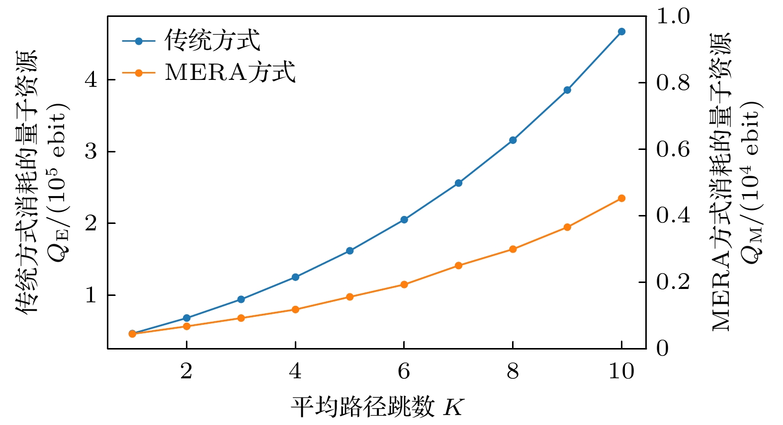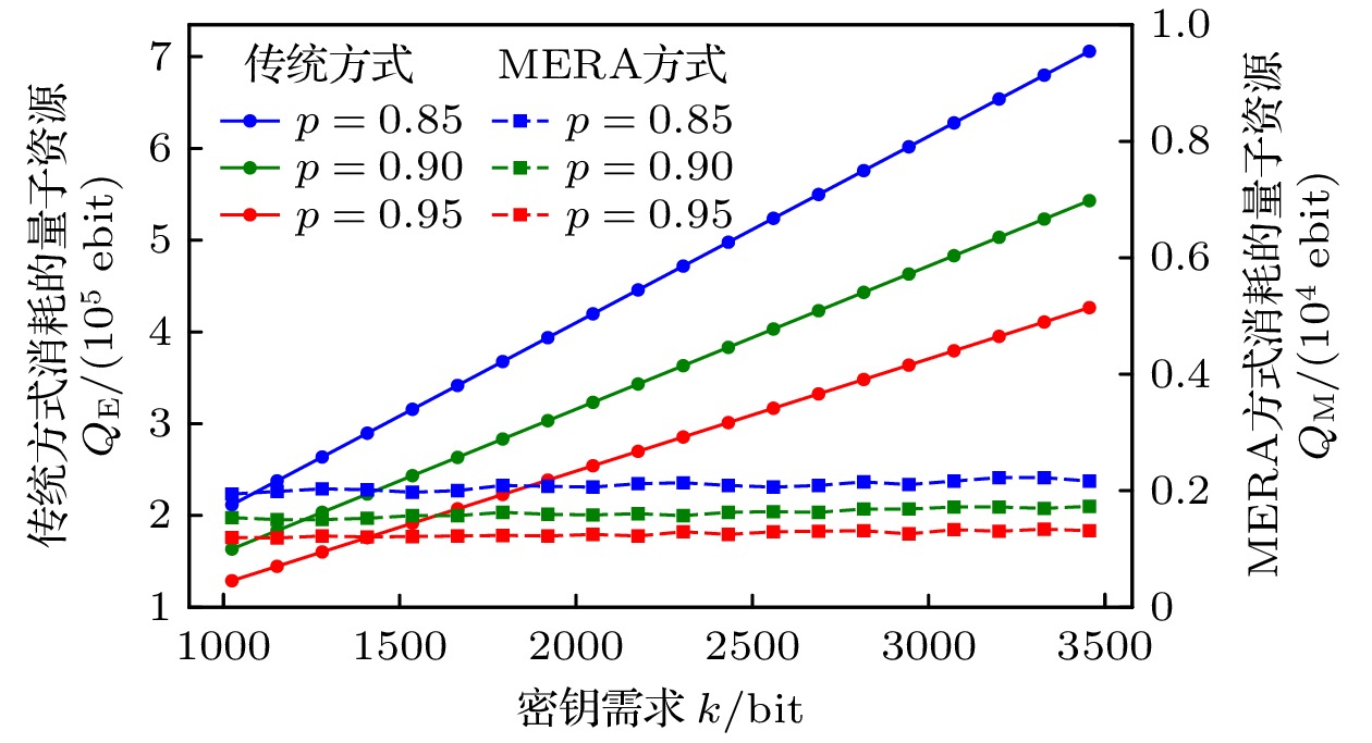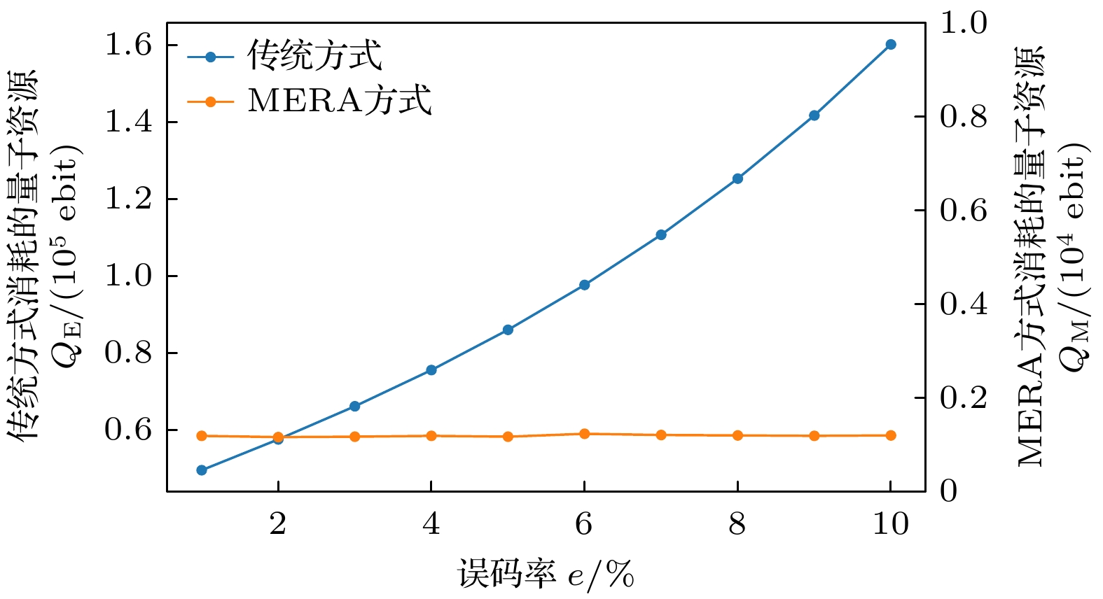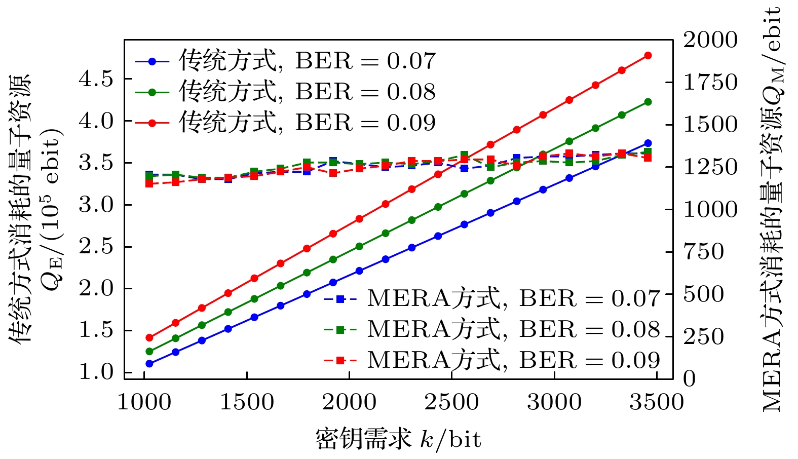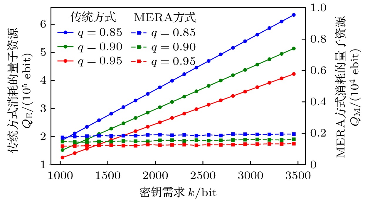 图9展示了量子资源和经典资源总和的变化趋势, 随着需求量的增加, 总资源消耗逐渐上升. 然而, 传统方式的资源消耗增长速度远高于MERA方式. 这主要是因为传统方式的密钥生成直接依赖于大量纠缠资源, 而MERA方式对纠缠资源的需求较弱, 因此其资源消耗增长较为缓慢. 由此可见, MERA方式在资源消耗方面具有显著优势.