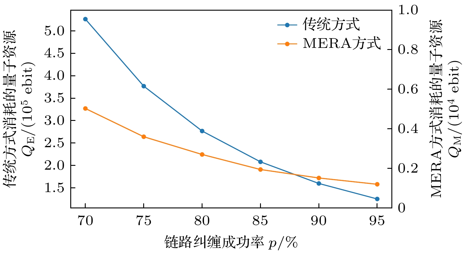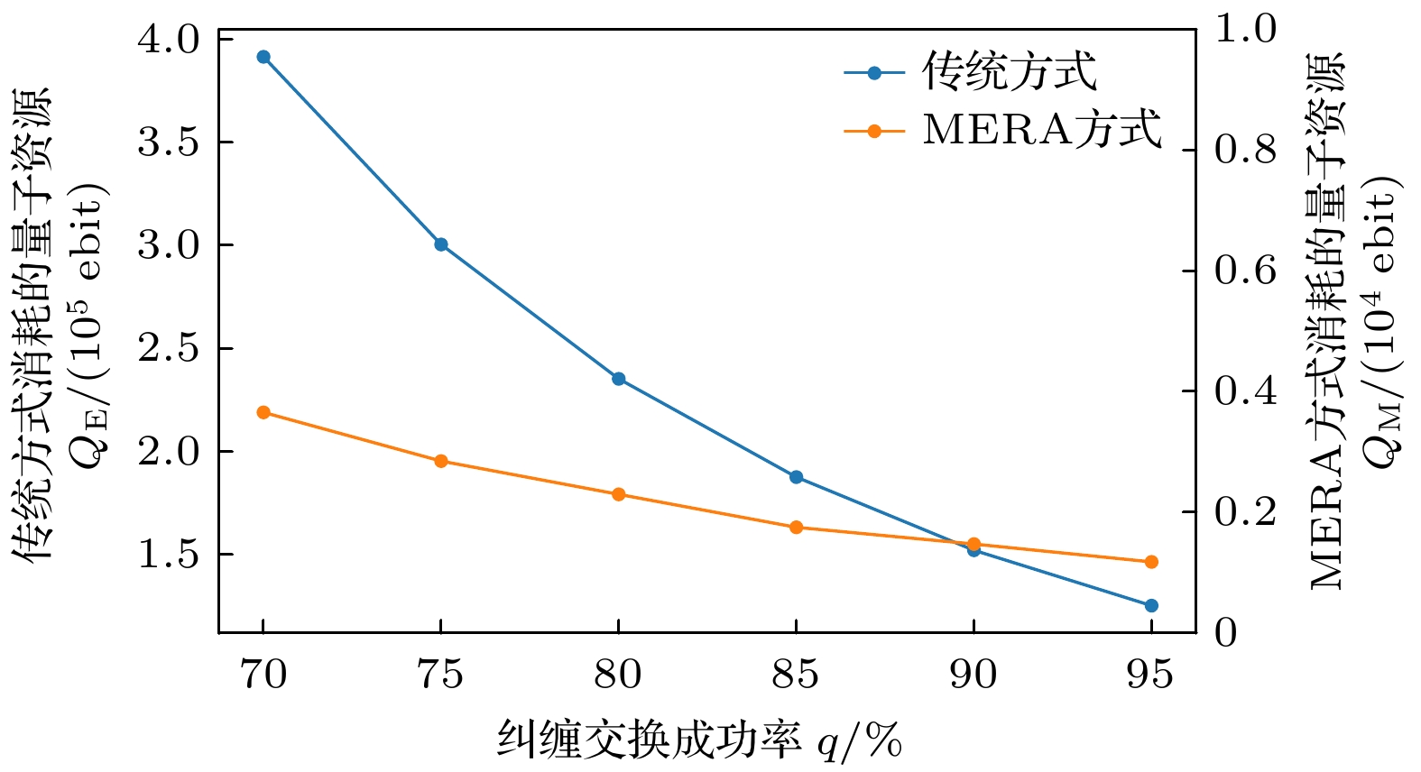 $ K = 4,\; e = 0.08, \;q = 0.95, k = 1024 $ . 根据图14, 链路纠缠成功率是量子网络中的关键物理参数, 受到具体物理器件性能的影响. 该参数直接决定远距离纠缠分发的成功率: 链路纠缠成功率越高, 远距离纠缠成功率也相应提高. 链路纠缠成功率提升时, 两种方式所需纠缠对的数量均呈指数级下降. 此外, 如图15所示, 在相同成功率下, MERA方法的资源消耗显著低于传统方法.5)纠缠交换成功率对资源消耗的影响