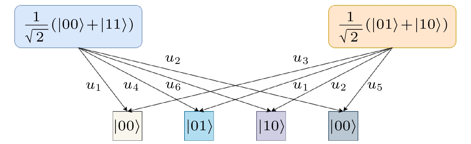 $ U = \left \{{\boldsymbol{u}}_{1}, {\boldsymbol{u}}_{2}, {\boldsymbol{u}}_{3}, {\boldsymbol{u}}_{4}, {\boldsymbol{u}}_{5}, {\boldsymbol{u}}_{6} \right \} $ , W有4种,$ W = \left \{{\boldsymbol{w}}_{1}, {\boldsymbol{w}}_{2}, {\boldsymbol{w}}_{3}, {\boldsymbol{w}}_{4} \right \} $ .U可以将纠缠态转换为直积态, 即解纠缠. 假设两点之间的纠缠如(1)式, 下面用