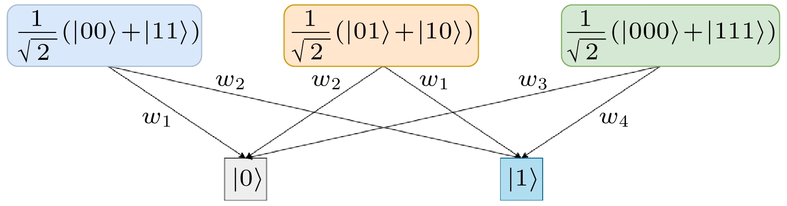 $ {\boldsymbol{A}}^{s_i} $ 是第i个量子比特上的张量,$ s_{i} $ 是量子比特的状态, n是MPS的长度. 例如: 三光子态$ \left|\varPsi\right\rangle = \dfrac{1}{\sqrt{3}}(\left|001\right\rangle+\left|011\right\rangle+\left|110\right\rangle) $ 的MPS形式可以表示为2) MPS态的压缩: 在共享MPS态之后, 控制器向双方下发压缩命令, 包括矩阵U和W的序列及压缩层数L. MERA的总层数L表示如下: