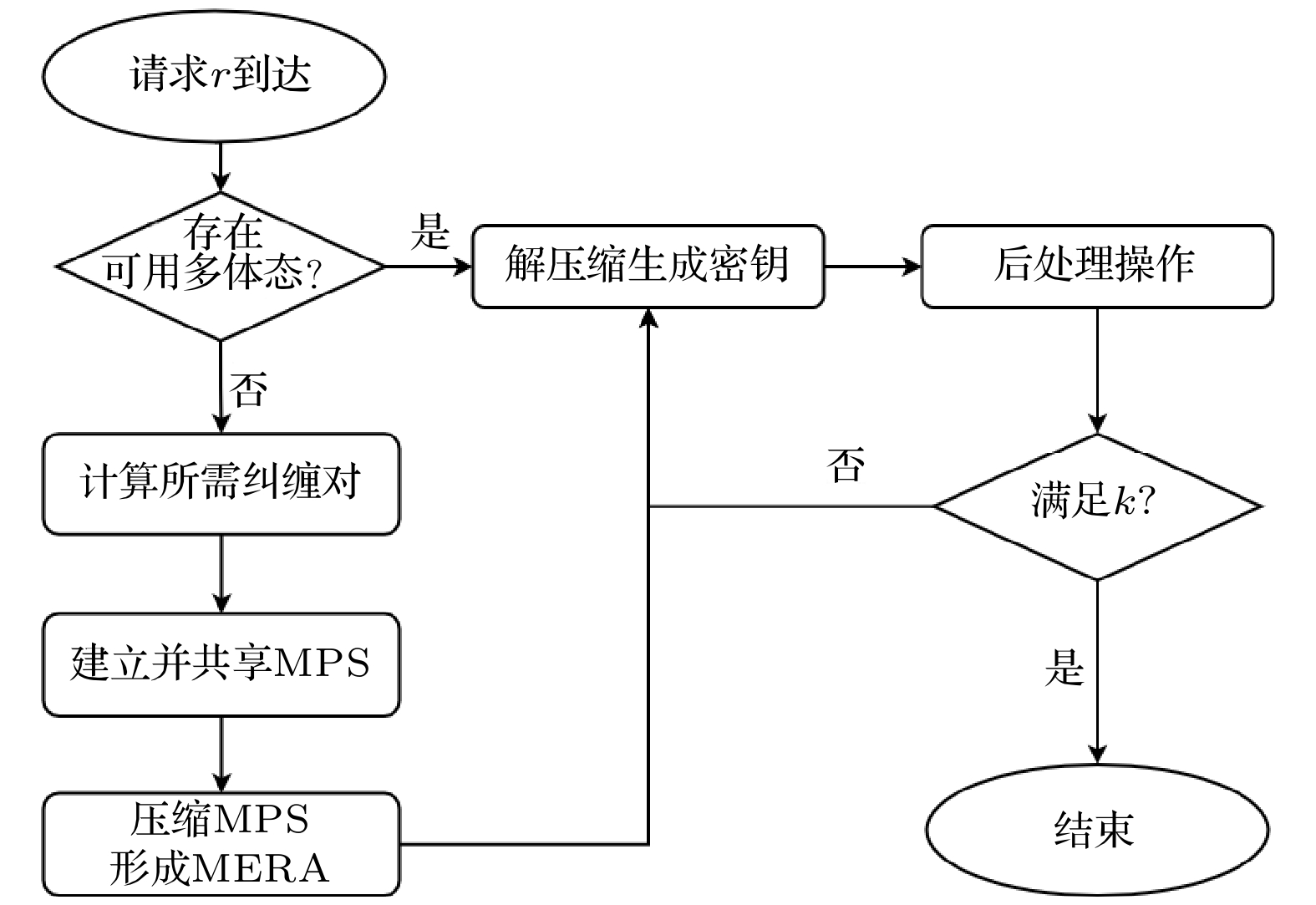 其中, k表示请求的密钥需求量, t表示解压缩次数, N表示MPS态所含光子数. 例如, 一个长度为2048的密钥请求, 在MPS态为256个光子, MERA态最高层为8时该请求需要