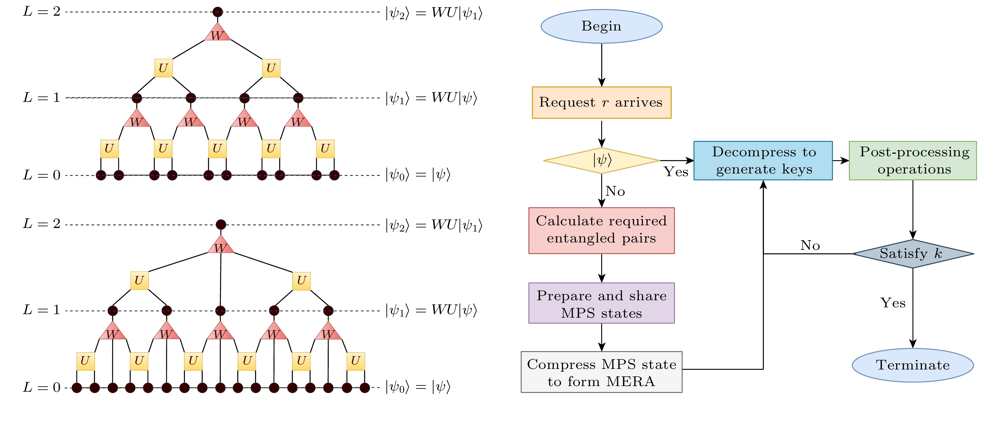 为应对这些挑战, 研究人员提出了多种方法, 包括量子压缩和密钥扩展, 以提升QKD的效率和安全性. 首先, Zhang等[27]提出了量子密钥扩展(quantum key expansion, QKE)协议, 不仅能扩展密码密钥, 提升密钥产生速率, 还能生成更长的密钥, 并抵御多种攻击, 从而增强QKD协议的安全性. 其次, MERA作为一种层次化的张量网络, 被Lai等[17]用于构建层次量子秘密共享(hierarchical quantum secret sharing, HQSS)方案. 该方案利用MERA的层次结构, 将参与者的信任和权限层次与MERA结构相关联, 并通过二元和三元MERA生成秘密份额. 这一动态结构允许对参与者进行晋升或降级, 以及新参与者的加入和旧参与者的退出, 确保了HQSS方案的灵活性和安全性. 尽管Lai等设计了等距映射W和解纠缠操作U来压缩原始态, 并通过逆映射无损地解压缩为原始态, 但尚未扩展其设计的等距张量在QKD协议中的应用. 最后, 纠缠态源的压缩也成为QKD协议中的一个重要研究方向. 由于当前量子处理器的原始性和多光子纠缠制备的难度, 对传输的量子数据进行压缩具有重要的实际意义. Lai等[28]通过构建等距张量实现了纠缠压缩, 这种压缩不仅提高了QKD协议的效率, 还能更好地抵御窃听, 提升了系统的安全性.
