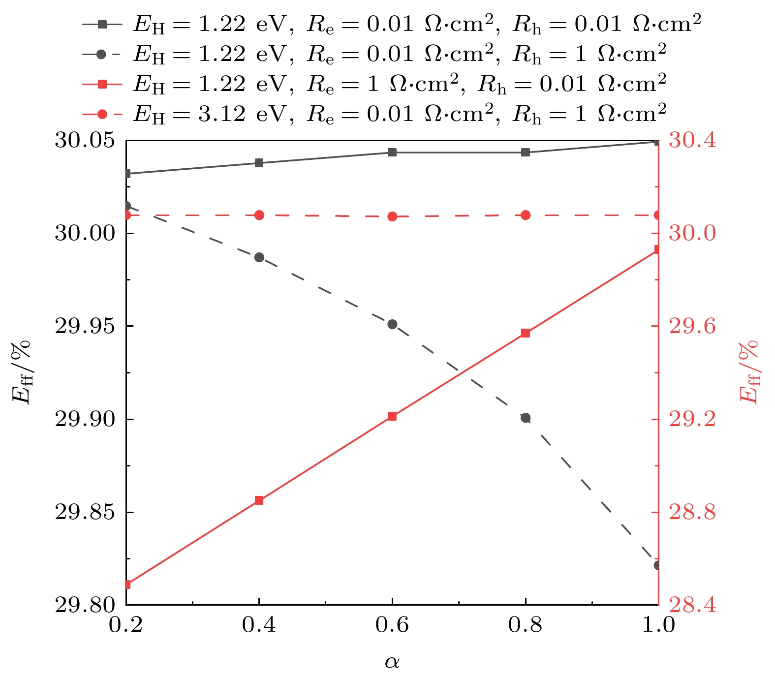 α越小, 透射光子越多, JH越小, JL越大, 相当于H支路的光学带隙降低, 但电学带隙保持不变. 由3.1节和3.2节可知, Rh的影响小于Re的影响, α越小, L支路电流越大, Re增强准费米能级分裂作用, 导致L支路辐射复合损失增大, 必然导致Eff下降, 并且Re越大, 效率损失越严重, 如图10所示, Re = 1 Ω·cm2和α = 0.2时Eff最小. H支路上, α越小, JH降低, EH足够大时, 如EH = 3.12, α的影响可以忽略不计; EH接近EL时, H支路电流增大, Rh增强准费米能级分裂作用, 降低α可以降低辐射复合损失, 增大转换效率, 如图Rh = 1 Ω·cm2时的计算结果, 但在Rh较小时, 可以忽略H支路复合损失, 增大α可以降低L支路的辐射复合损失, 如图Rh = 0.01, 0.1 Ω·cm2时的计算结果.