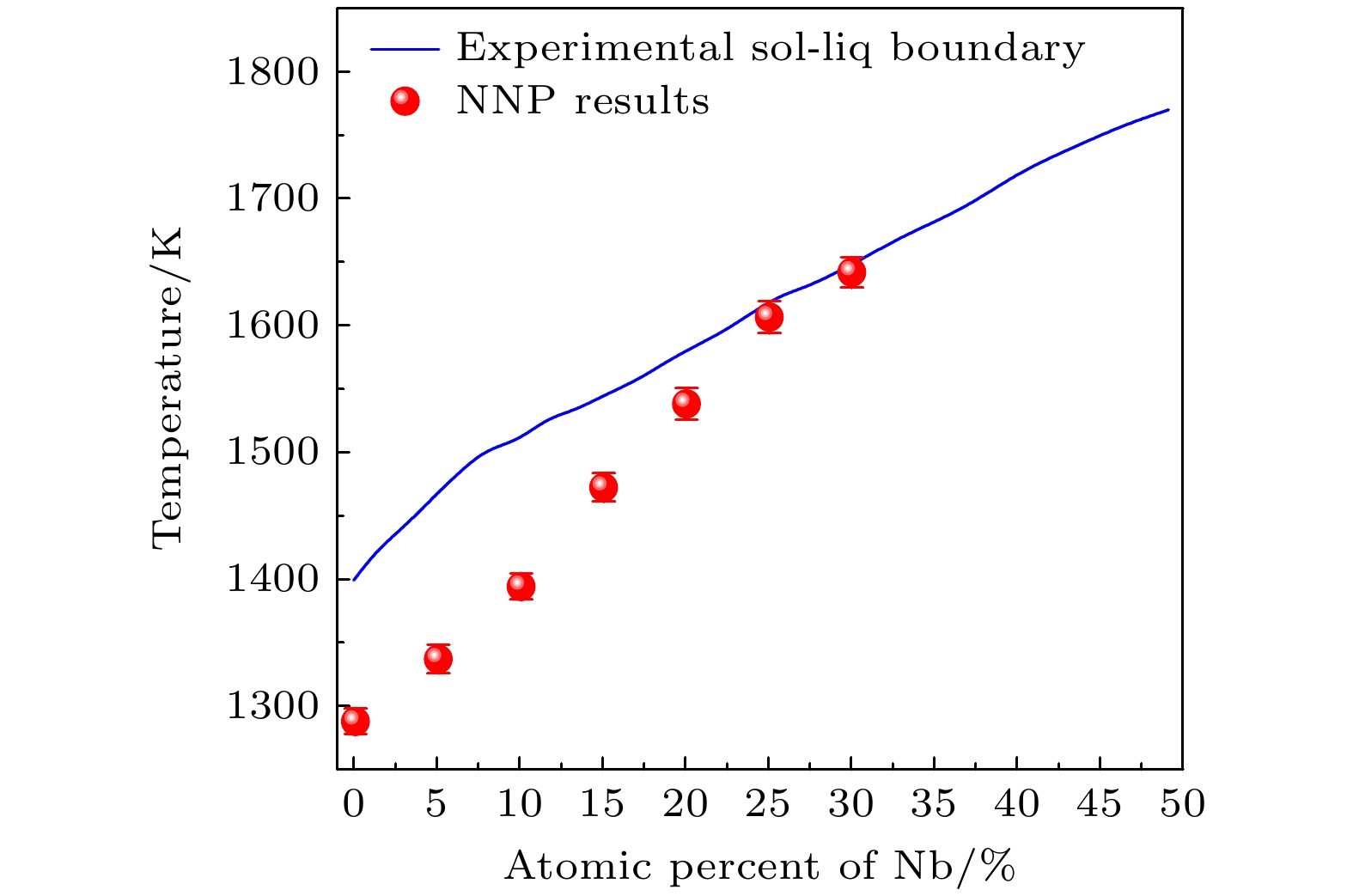 为了验证NNP对于铀合金体系热力学特性的计算精度, 使用固-液相平衡方法计算了铀单质的熔点. 根据实验相图[2,43], 铀在高温下处于体心立方的$ \gamma $相, 实验测得的熔点大约是1400 K. 因此, 我们构建了包含8000个铀原子的固-液两相界面, 并进行了350 ps的分子动力学模拟以获得平衡结构. 结果如图7所示, 从图中可以看到, 在350 ps时, 固相和液相已经达到了温度平衡. 通过对尾部温度的统计, 我们得到体系的熔点(固-液平衡点)为(1286±9) K. 我们使用同一数据集下训练得到的其他势能模型进行了进一步模拟, 发现训练造成的误差不超过50 K. 因此, 这一差异可能来源于DFT对铀5f电子的描述不准确引入的系统偏差, 或由于熔体铀中可能存在的氧杂质稳定了液体结构. 但随着Nb原子比例的增加, 体系熔点快速接近实验的固-液共存线(图8), 表明该势函数再描述铀铌合金时更加准确.