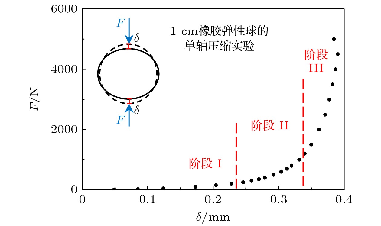 Tatara等[18]于1991年进行了大变形范围内1 cm橡胶弹性球的单轴压缩实验, 在10—5000 N外加荷载下测量了橡胶球的弹性位移和接触半径. 根据Tatara等[18]的实验数据, 得出单球颗粒法向重叠量