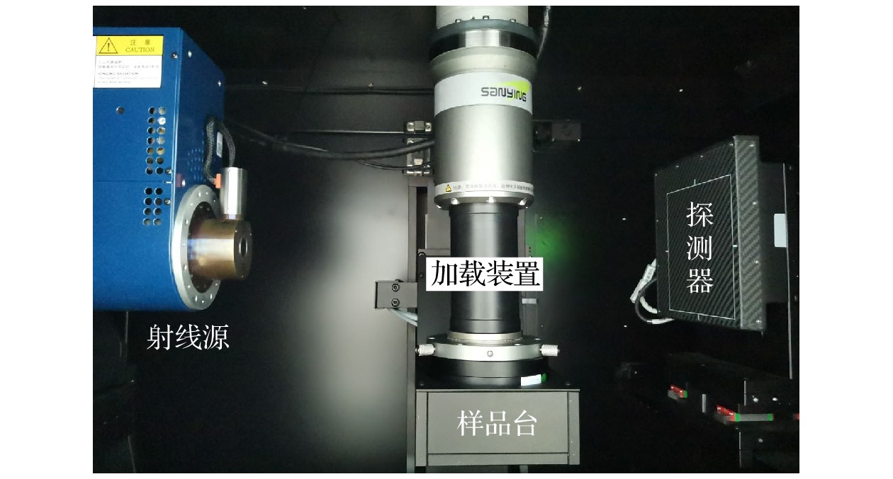 实验设备采用天津三英精密股份有限公司生产的高分辨率综合扫描分析系统nanoVoxel-2792, CT系统如图3所示, 主要由射线源、载物转台和探测器三者组成, 加载装置为基于该micro-CT设计的原位加载测试系统CT-020. 三者的相对位置由丝杆与步进电机控制, 以调整成像放大倍数. 图像采集过程中, 射线源发出X射线穿过加载装置及内部样品, 探测器接收射线, 完成一次曝光得到的射线投影图像称为二维断层灰度(digital radiography, DR)图像, 连续拍摄样品台旋转过程中的多幅DR图像并重建被测物三维空间结构称为计算机断层扫描(computed tomography)成像. 实验中, micro-CT系统采用最大管电压130 kV, 最大电流100 μA. 探测器阵列为1536 pixel × 1536 pixel, 有效成像视野为130 mm×130 mm, 曝光时间0.5 s, 采集帧率720 frame/s.