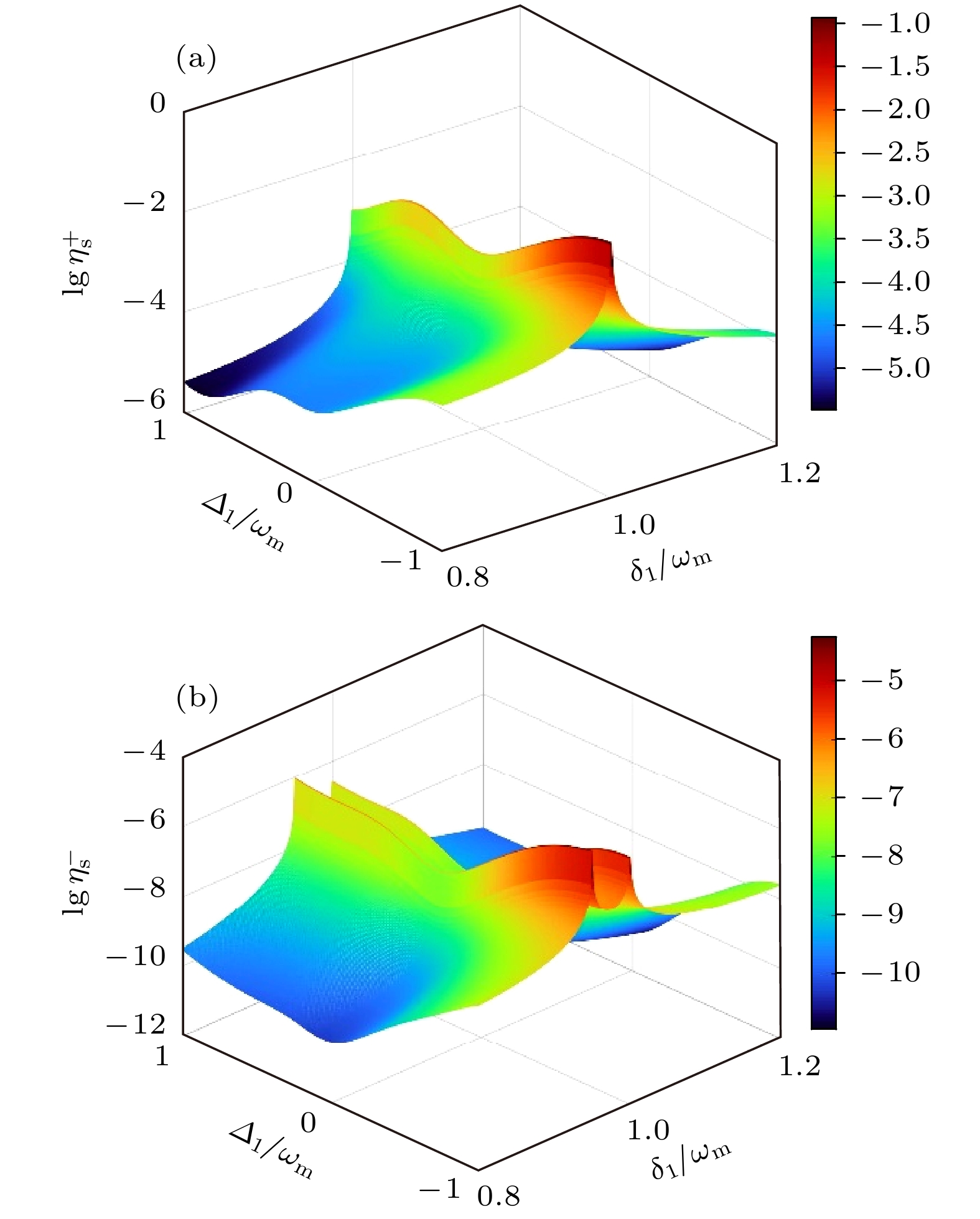 $\lg \eta _{\text{s}}^{{ \pm }}$ 作为原子失谐${{{\varDelta _1}} {/ } {{\omega _{\text{m}}}}}$ 和探测失谐${{{\delta _1}} {/ } {{\omega _{\text{m}}}}}$ 的函数关系图. 从图2可以观察到, 和边带的效率谱在原子红失谐$\left( {{\omega _{\text{c}}} \leqslant {\omega _{\text{a}}}} \right)$ 下明显要比处于原子蓝失谐$\left( {{\omega _{\text{c}}} \geqslant {\omega _{\text{a}}}} \right)$ 下的颜色更鲜艳, 这表明在处于原子红失谐下, 和边带的效率要更高; 并且上、下和边带都在${\varDelta _1} = - {\omega _{\text{m}}}$ 获得最大生成效率. 如图2(a)所示, 上和边带的效率谱呈现单峰的峰值结构, 其只在${\delta _1} = {\omega _{\text{m}}}$ 出现一条类似山脉的凸起; 这也说明可以通过适当调节探测场的失谐频率${\delta _1}$ 增强和边带的产生效率. 值得注意的是, 原子失谐频率在$ - {\omega _{\text{m}}} < {\varDelta _1} < 0$ 范围内, 和边带信号急速下降; 而在原子蓝失谐下, 和边带的效率呈现先增后减的趋势, 并在大概${\varDelta _1} = 0.5{\omega _{\text{m}}}$ 处达到局部极大值. 这是因为原子从基态跃迁到激发态, 其跃迁频率高于泵浦场频率时, 由于此时原子的本征非线性较强, 以至于对于复合腔-原子系统中控制场的要求不高, 即使在弱驱动作用下也能产生极强的和边带. 如图2(b)所示, 与上和边带不同, 下和边带的效率谱出现双峰结构, 分别在${\delta _1} = 0.95{\omega _{\text{m}}}$ 和${\delta _1} = {\omega _{\text{m}}}$ 处出现增强峰; 并且其左侧峰值明显略高于右侧. 这表明两能级原子系综的介入, 可以改变下和边带产生的匹配条件. 下和边带的效率在原子红失谐下表现出下降的趋势, 而在原子蓝失谐下呈现效率上升. 需要留意的是, 上、下和边带的峰值结构在${\varDelta _1} = 0$ 处都出现了波谷, 产生这一物理现象也从侧面表明两能级原子系综的加入, 急剧增强了复合腔光力系统的非线性效应, 使得原本光学腔场和机械振子之间的弱光力耦合非线性作用增强, 从而提高了和边带产生的效率.其次, 为了研究泵浦功率对于腔-原子复合系统中和边带的影响, 图3所示为和边带的效率谱