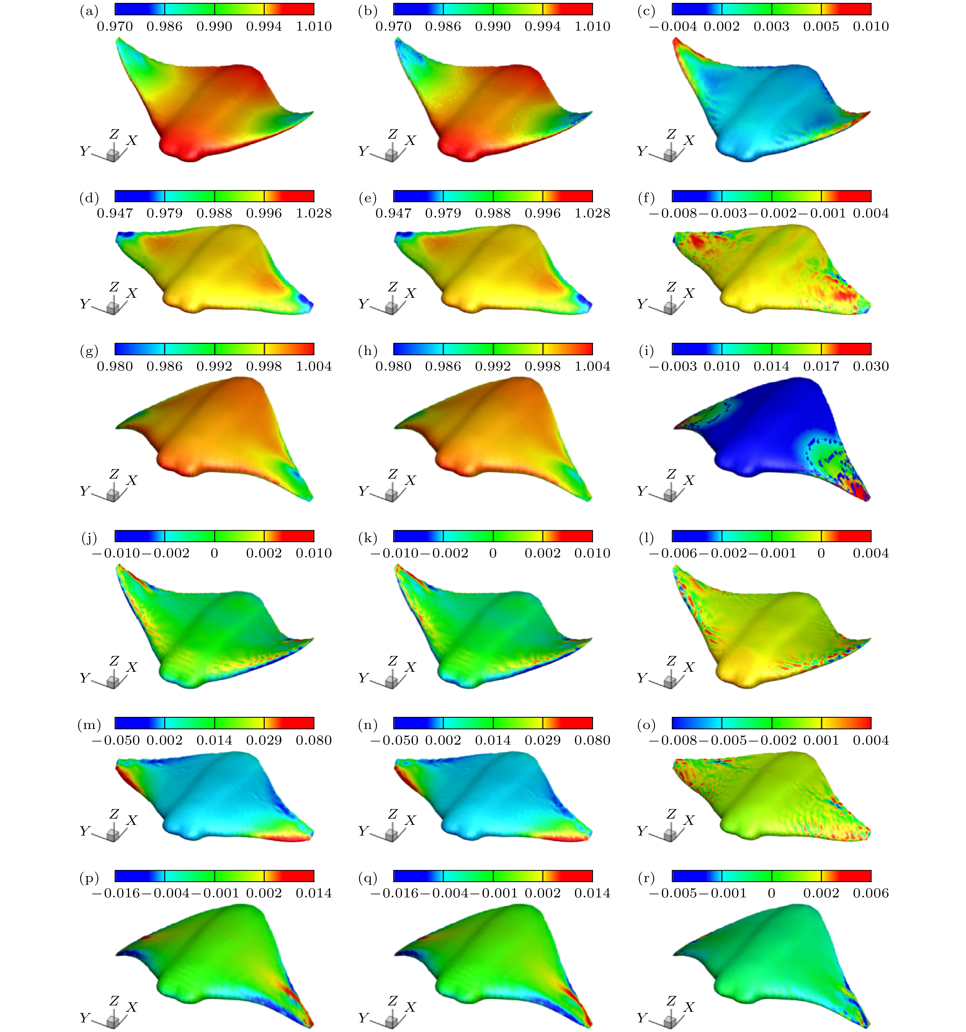 Figure 11.  Prediction results and errors of pressure and velocity fields in extrapolation test cases: (a), (d), (g) True values ofdynamic pressure field from CFD simulations; (b), (e), (h) pressure field predicted by surf-DDPM AI model; (c), (f), (i) absoluteer-ror contour of pressure field; (j), (m), (p) true values of velocity flow field from CFD simulations; (k), (n), (q) velocity fieldpre-dicted by surf-DDPM AI model; (l), (o), (r) absolute error contour of velocity field.