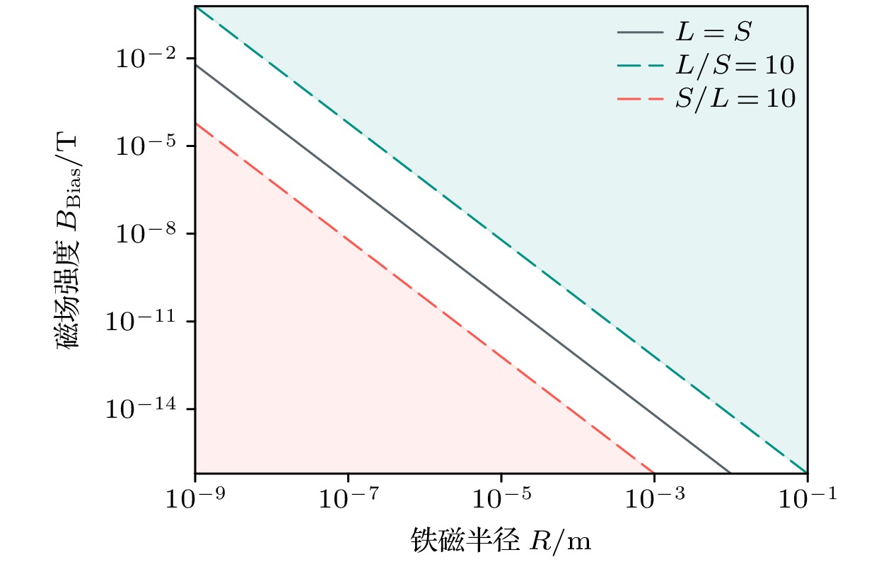 $ \omega_{{\mathrm{T}}}=\sqrt{\mu B_{{\mathrm{Bias}}}/I} $ 的角频率进行扭摆运动, 称为铁磁扭摆振子, 即FMTO; 自旋角动量远大于刚体角动量时, 则如图1中右图所示, 铁磁体以拉莫尔频率$ \omega_{{\mathrm{L}}}=\gamma_{0}B_{{\mathrm{Bias}}} $ 绕磁场陀螺进动[18], 称之为铁磁陀螺即FMG. 研究指出, FMTO和FMG在磁场测量领域均有着极高潜力, 二者区别在于FMG系统铁磁半径较小且磁场较弱, FMTO则要求较大铁磁半径或较强外场.铁磁体刚体角动量与自旋角动量之比为