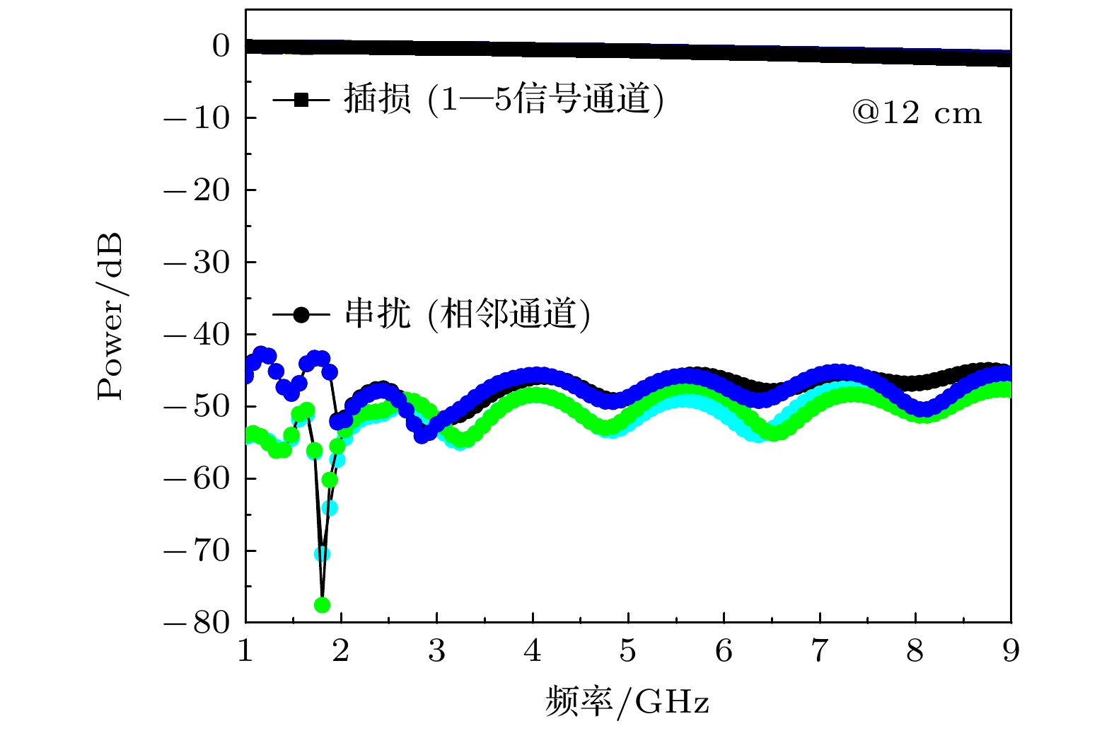 对PI-YBCO-PI结构的超导传输线进行漏热值测量, 该传输线样品尺寸为长12 cm、宽1 cm, 由于该样品没有进行图形制作, 所以测得的漏热值为1 cm宽的传输线整体漏热值. 利用G-M制冷机进行漏热测试, 共进行两次测试, 即空载(无样品)和搭载传输线样品两种情况下进行测量, 并通过温控仪(Lakeshore Model 336)控制一级和二级冷台的温度, 使得一级冷台和二级冷台分别稳定在40 K和4.2 K, 通过计算空载和搭载传输线样品时制冷机冷量, 两个实验的冷量差即为40—4.2 K传输线带来的漏热数值. 测试结果表明, 长12 cm, 宽1 cm的传输线样品的漏热值为0.238 mW. 通过仿真, 在特征阻抗设计为50 Ω和相邻两个通道间的串扰小于–40 dB的情况下, 1 cm宽的传输线样品共可以制作5条信号通道, 且每条12 cm长的信号通道在9 GHz处的插损小于 –2 dB, 其中最外侧的信号线串扰相较于其他通道稍差, 是因为两侧存在边缘效应, 导致仿真结果存在差异, 具体仿真结果如图9所示. 即5个信号通道的漏热值为0.238 mW, 每1个通道所引起的漏热值平均为47.6 μW.
