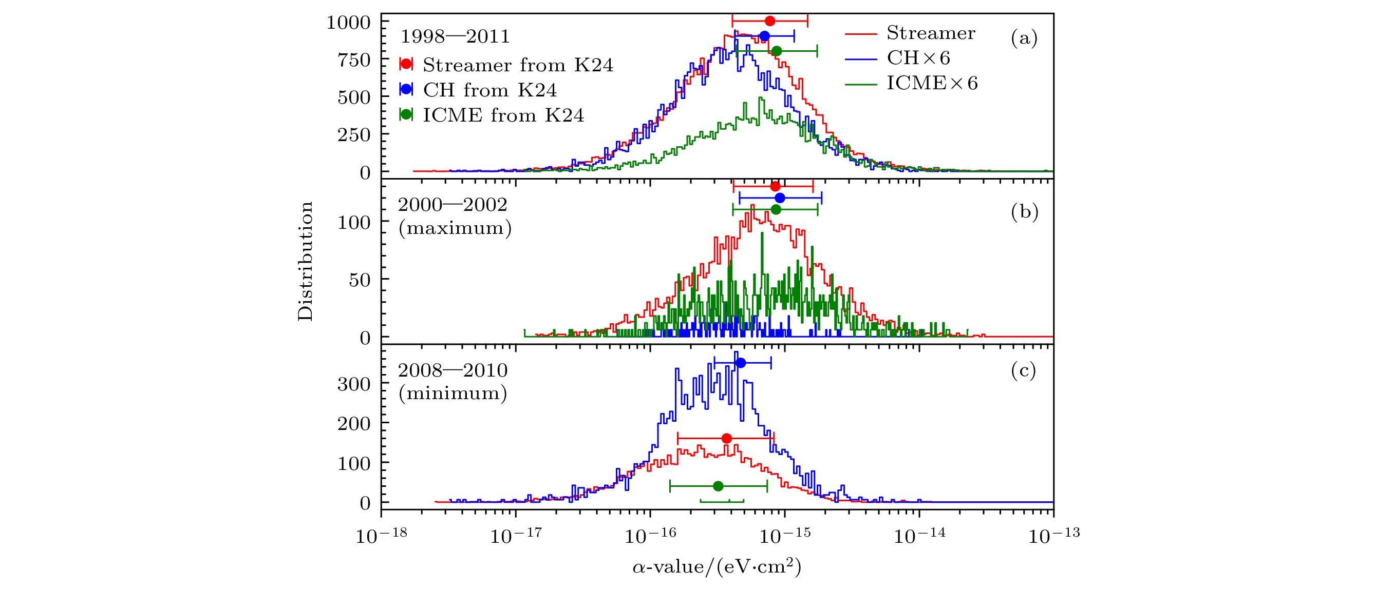 Figure 4. Statistical distribution of solar wind charge-exchange emission factor α-value during different observational period and for different solar wind sources, as well as its comparison with the results of Koutroumpa[23] (K24). Streamer: red step lines and filled circles with errorbars, CH: blue lines and symbols, ICMEs: green lines and symbols. For comparison, the statistical distribution of CH and ICMEs are multiplied by an arbitrary value of six. (a) Full period of 1998—2011; (b) 2000—2002 of solar maximum; (c) 2008—2010 of solar minimum.