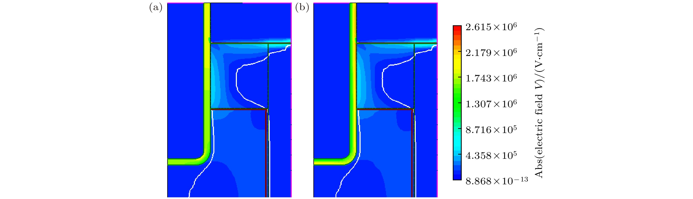 在建立的SiC DTMOSFET器件模型栅氧化层中引入氧化物固定电荷前后器件内部的电场强度变化情况如图10所示. 通过对比发现, 氧化层中引入氧化物固定电荷后, 器件栅氧化层中靠近沟道处的电场强度明显变大. 根据以上的微观物理现象结合器件宏观电学参数的变化情况, 说明在氧化层中引入一定浓度的氧化物固定电荷会造成栅极氧化层区域的电势增加, 从而导致器件P-基区不断地耗尽空穴, 形成一小块耗尽区域, 使得栅氧层的电场强度增大, 器件的阈值电压不断减小. 因此可以得出, 总剂量效应引入的氧化物陷阱电荷会使器件栅极氧化层电场强度急剧增加, 导致器件转移特性曲线负漂移, 器件的阈值电压减小, 这与前序实验所得结论一致.