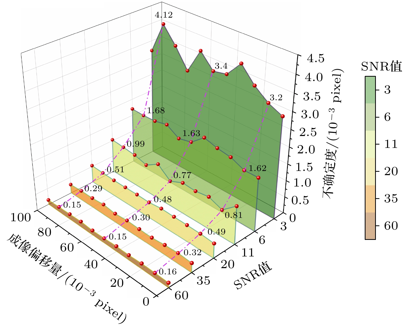 为评估信号信噪比(SNR)对检测精度的影响, 采用蒙特卡罗方法进行仿真实验. 信噪比定义为: SNR = S/N, 其中S为信号强度, N为噪声的标准差. 实验过程中, 生成6组不同SNR的刻槽信号(SNR = 3, 6, 11, 20, 35, 60), 每组包含11幅具有不同成像漂移量的刻槽信号. 为降低随机性对结果的影响, 在每组SNR和漂移量条件下均进行500次仿真, 并对成像漂移进行检测. 随后, 计算检测漂移量与输入偏移量之间的偏差, 并以500次检测误差的标准差作为拟合不确定度的衡量指标.