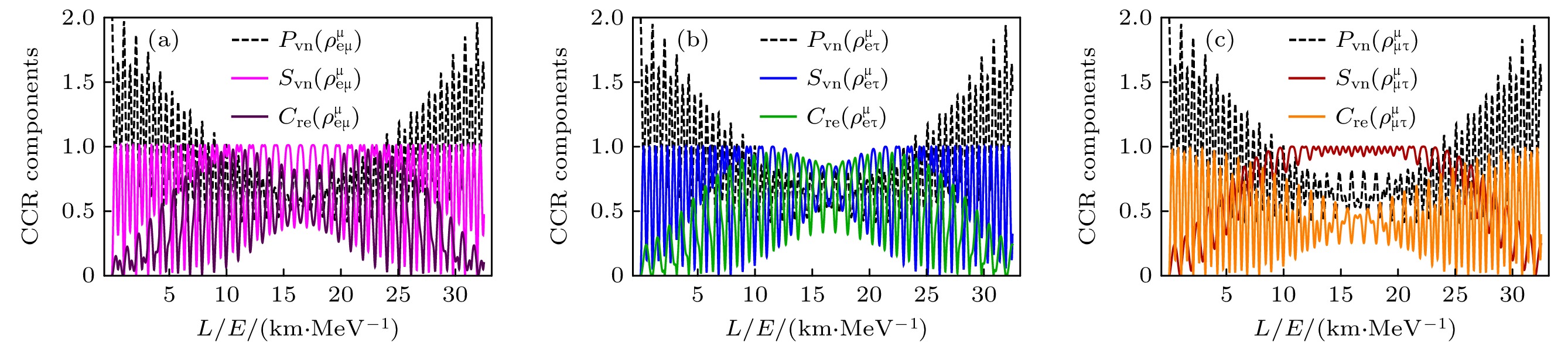 ${\mathrm{e}}{\text{μ}}$ subsystem; (b) the complete complementarity relation terms for${\mathrm{e}}{\text{τ}}$ subsystem; (c) the complete complementarity relation terms for${\text{μ}}{\text{τ}}$ subsystem.图 12 (53)式描述的完全互补性关系中的相关项在三味μ子中微子振荡中的演化[58] (a)子系统