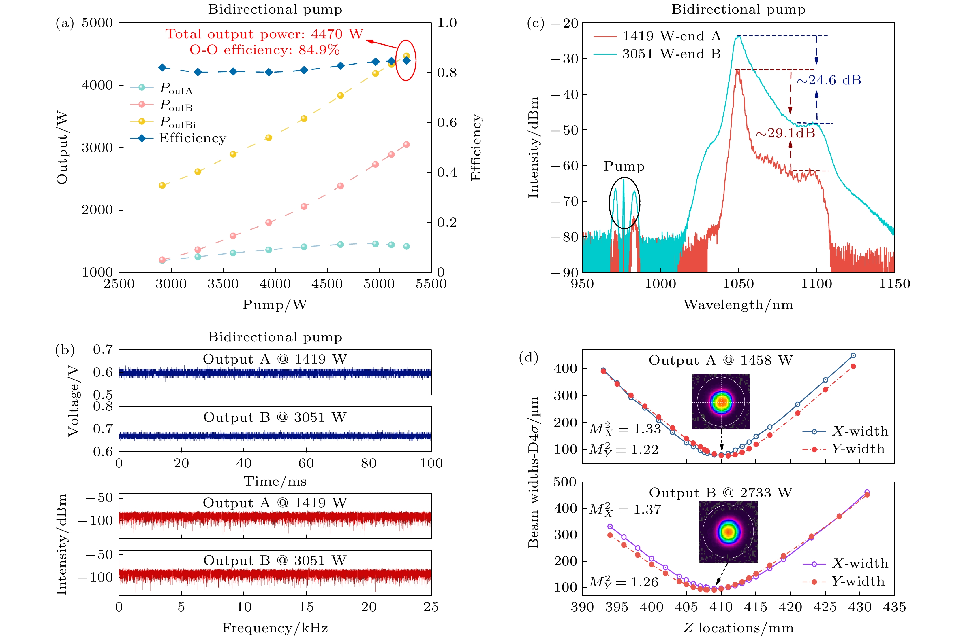 考虑在双端输出光纤振荡器中, 相同泵浦波长下双向泵浦方式与单向泵浦相比可以显著提升TMI阈值[23], 因此采用双向泵浦方式来进一步提升输出功率, 双向泵浦实验结果如图5所示. 此时两端输出功率和总输出功率随着泵浦功率的增加呈线性增长, 且B端输出功率仍然高于A端, 这与单向泵浦时候的情况一致. 随着泵浦功率增大, 激光器光光效率整体保持在80%—85%之间. 在双端最高总泵浦功率为5262 W, A端的输出功率为1419 W, B端的输出功率为3051 W, 此时双端输出总功率为4470 W, 如图5(a)所示, 光光转换效率为84.9%. 在最高输出功率测得的输出激光时域信号和对应的傅里叶频域如图5(b)所示, 可以看到A, B两端的时域信号保持稳定, 对应的傅里叶频谱没有观察到特征尖峰, 表明此时该激光器没有发生TMI效应. 在最高输出功率下, 采集A, B两端输出光谱图如图5(c)所示, 可以看到信号激光中心波长在1050 nm, 由于镱离子对1050 nm短波长激光有一定的重吸收作用, 在光谱上出现了较强的ASE效应, 且光谱存在严重展宽. 另外从输出光谱图上可以看到在1100 nm附近出现明显的SRS效应, 在最大输出功率时, A端输出光谱的拉曼抑制比约为29.1 dB, B端拉曼抑制比约为24.6 dB. 在输出功率为1458 W和2733 W时测得的光束质量和光斑轮廓如图5(d)所示, 光束质量M2因子