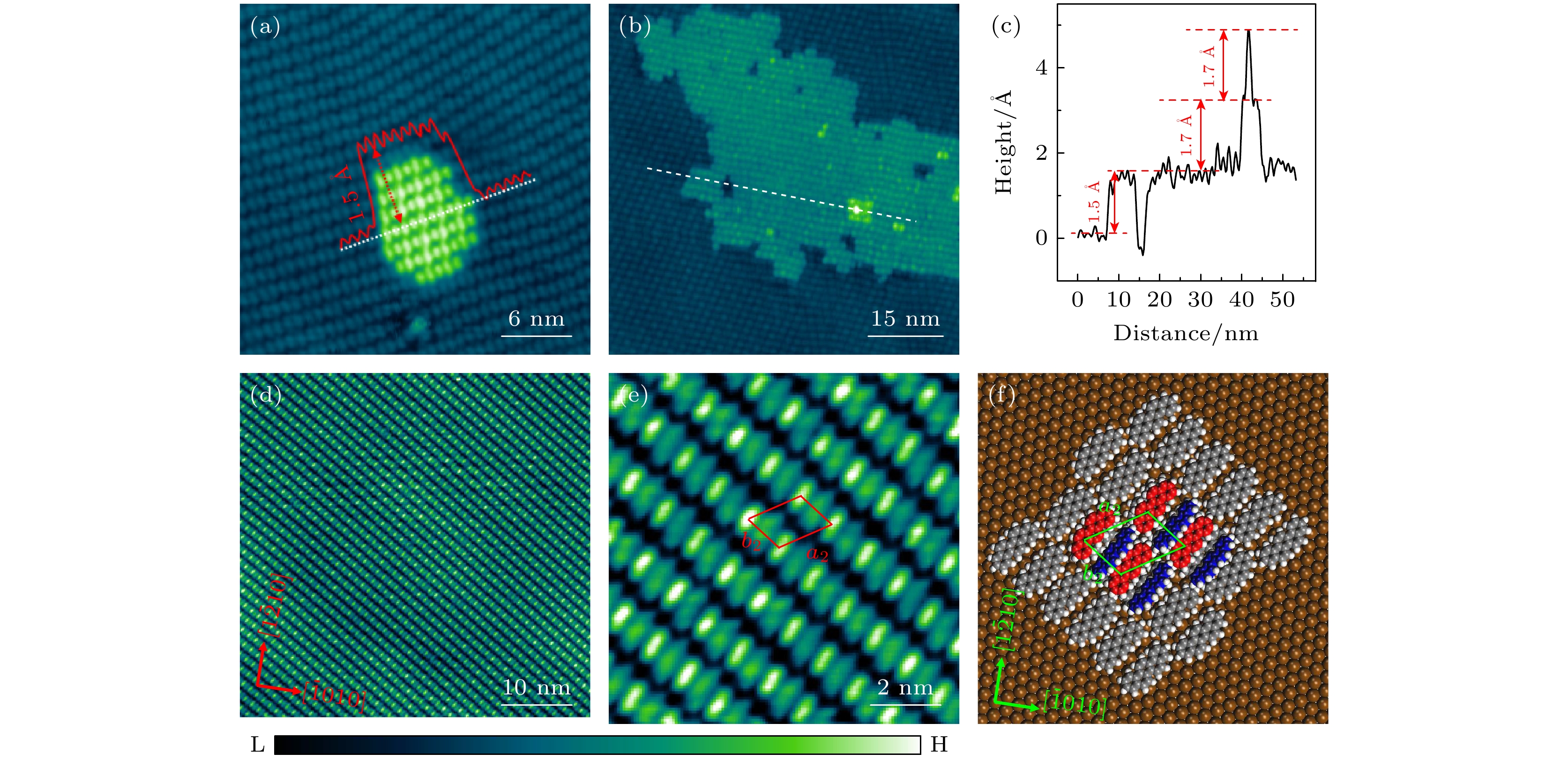 图 5 第2层分子形成的分子带阵列 (a) 覆盖度为1.1 ML时形成的第2层分子岛 (2.0 V, 20 pA); (b) 覆盖度为1.4 ML时形成的第2层和第3层分子岛 (2.0 V, 20 pA); (c) 沿(b)图中白色虚线所做的高度投影图; (d) 覆盖度为2.2 ML时形成的大面积第2层分子带 (1.2 V, 20 pA); (e) 第2层分子带的高分辨STM图像(0.9 V, 20 pA); (f) 第2层分子带与于第1层分子和衬底晶格的结构关系图