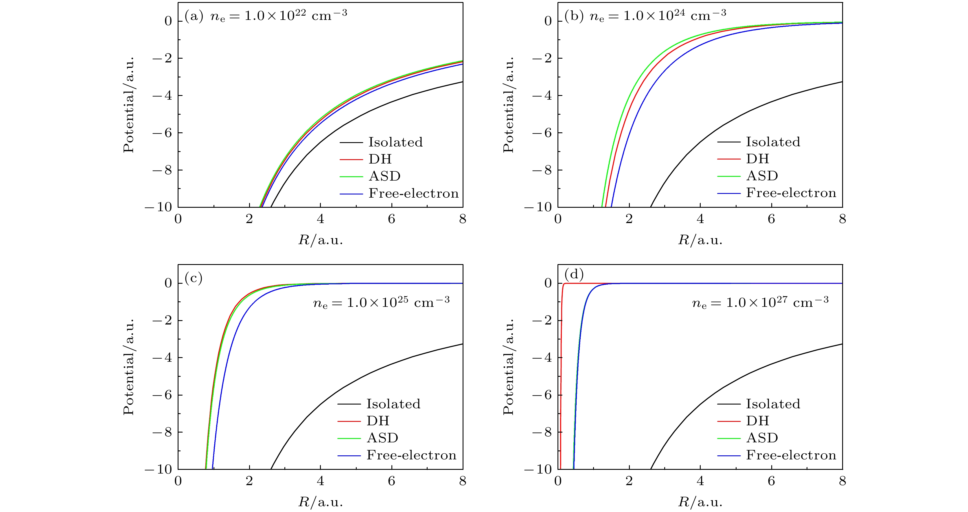 不同屏蔽模型考虑了不同的效应, 因此产生不同的屏蔽势. 图1所示为孤立的(isolated)、原子态分辨(ASD)模型的Fe25+离子基态势能, 并和自由电子(free-electron)、DH屏蔽模型的结果进行比较. 可以看到, 当密度开始增大, ASD模型的势能比DH模型大, 然而密度继续增大, DH模型的势能逐渐反超ASD模型的, 这是因为DH模型的密度分布为玻尔兹曼分布的一阶线性近似, 没有考虑稠密等离子体中的简并效应, 因此高估了屏蔽效应. 而ASD模型通过考虑负能电子分布包含了简并效应, 因此当密度继续增加, 简并效应增强时, 其屏蔽势的增加没有DH模型多. 对于自由电子模型, 可以看到其势能随着密度的变化始终小于ASD模型, 且和ASD模型之间的差异随密度先增大后减小. 这是因为密度增大, 耦合增强, 负能电子密度增大; 而密度继续增大, 简并效应开始增强, 负能电子密度减小, 最终ASD模型的势能收敛到自由电子模型.