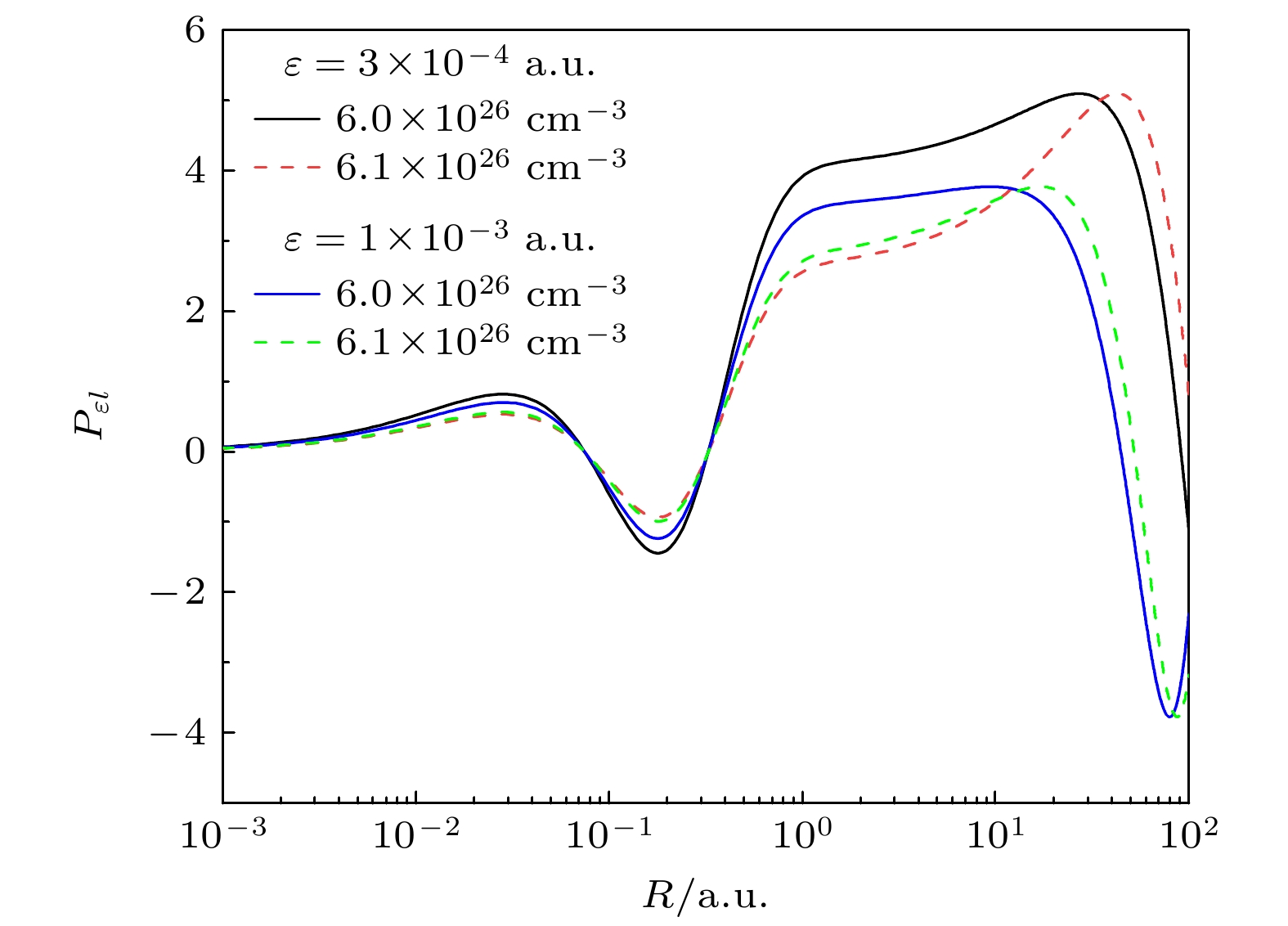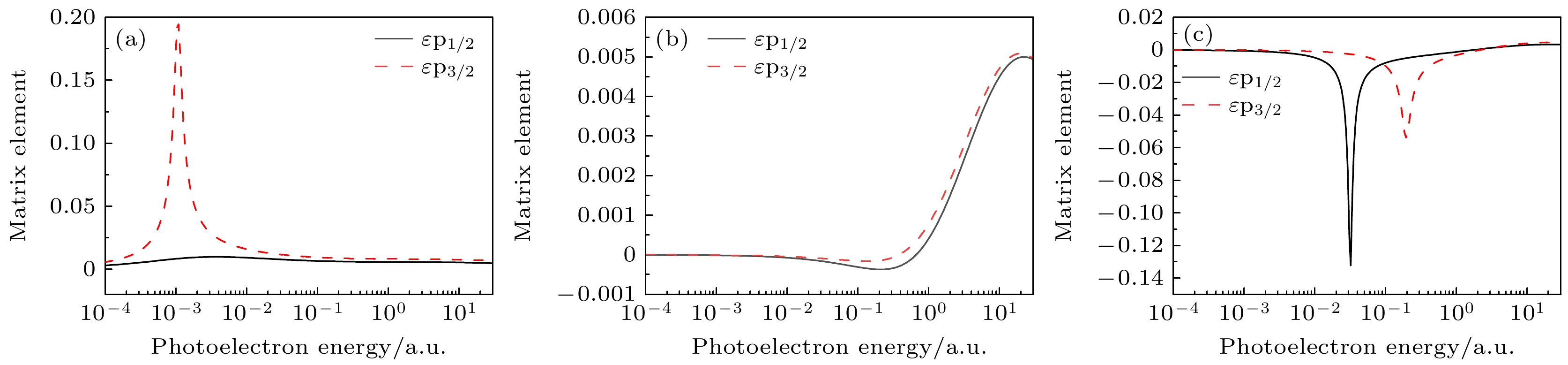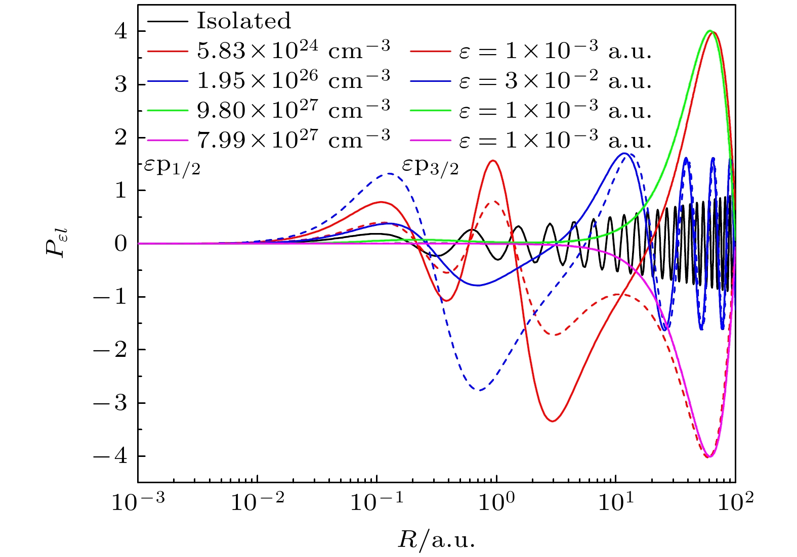 $ \left\langle {nl\left| r \right|\varepsilon , l + 1} \right\rangle $ , 导致偶极矩阵元在阈值附近经过0, 这表现为光电离截面出现一个很深的极小值.为了分析截面出现势形共振和Cooper极小时偶极矩阵元的表现, 图6分别给出了电子密度为5.8×1024, 7.99×1027和9.8×1027 cm–3时2s1/2激发态的偶极矩阵元. 观察图5可以发现, 密度为5.8×1024 cm–3时, 2s→εp3/2通道的截面出现势形共振峰, 而2s→εp1/2通道没有. 这两个跃迁的偶极矩阵元也是如此. 密度为7.99×1027 cm–3时, 2s→εp1/2和2s→εp3/2通道的矩阵元均经过0值, 这体现为对应截面出现Cooper极小. 密度为9.8×1027 cm–3时2s→εp1/2和2s→εp3/2通道的光电离截面同时出现了势形共振峰和Cooper极小现象. 这两个通道的跃迁矩阵元在该密度下出现了极大的谷, 这是势形共振导致的谷, 掩盖了随后出现的cooper极小导致的变化.