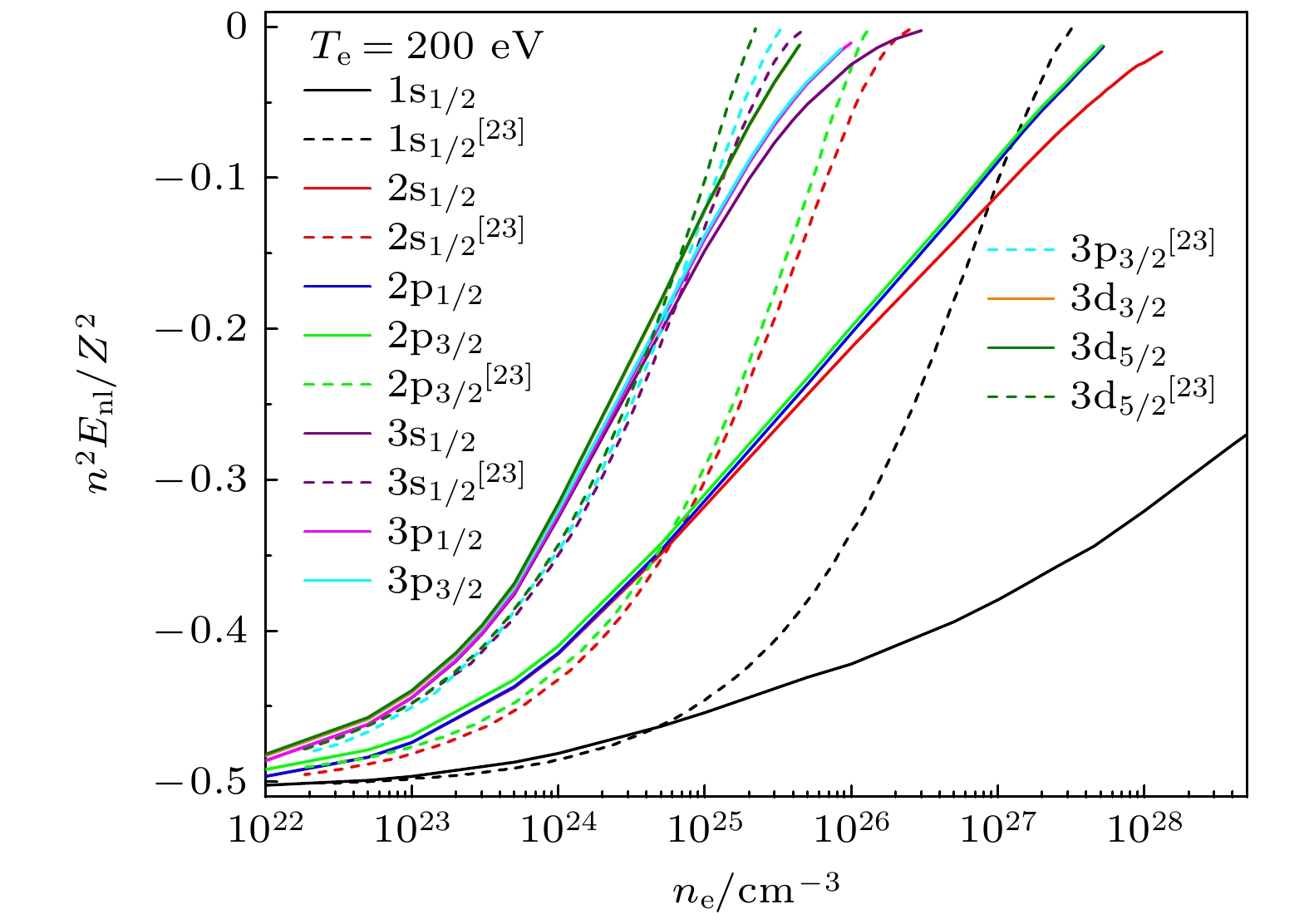 Figure 3. Scaled energies of ground and n ≤ 3 excited states of Fe25+ ion as a function of electron density for a fixed plasma temperature Te = 200 eV, the solid line is the result of ASD model, and the dotted line is the calculation result from DH model adopted by Xie et al.[23].