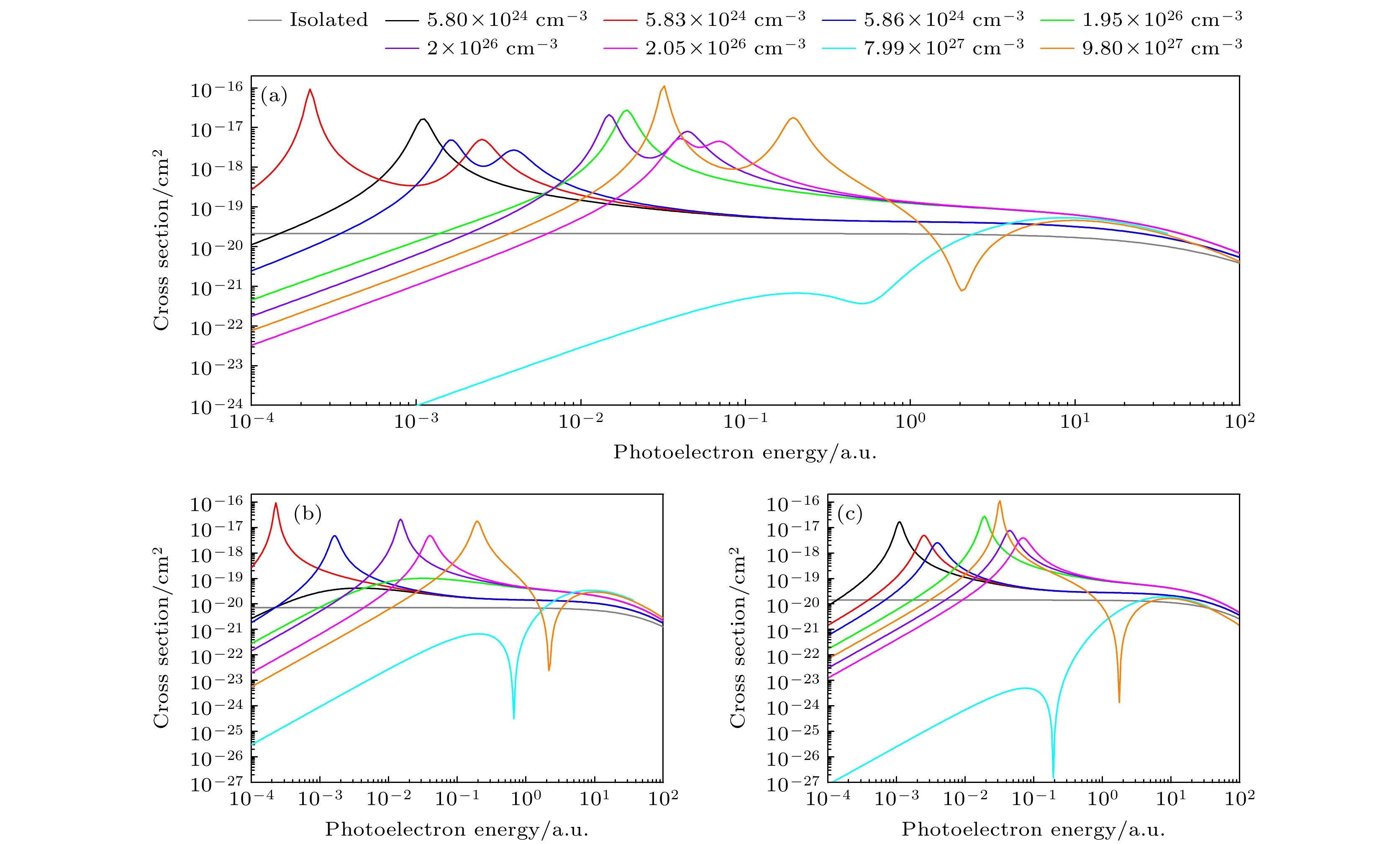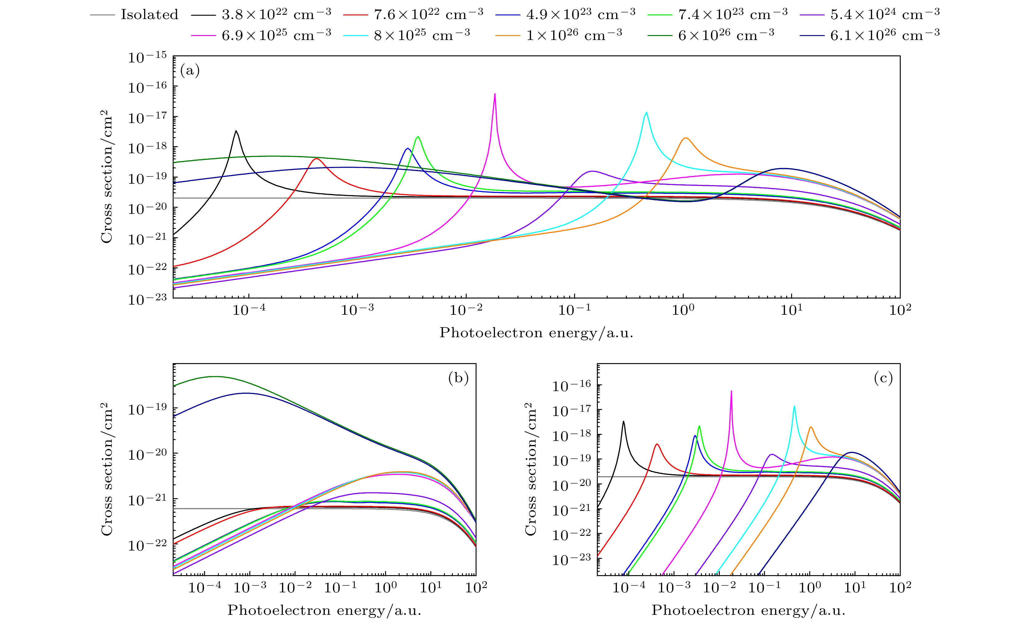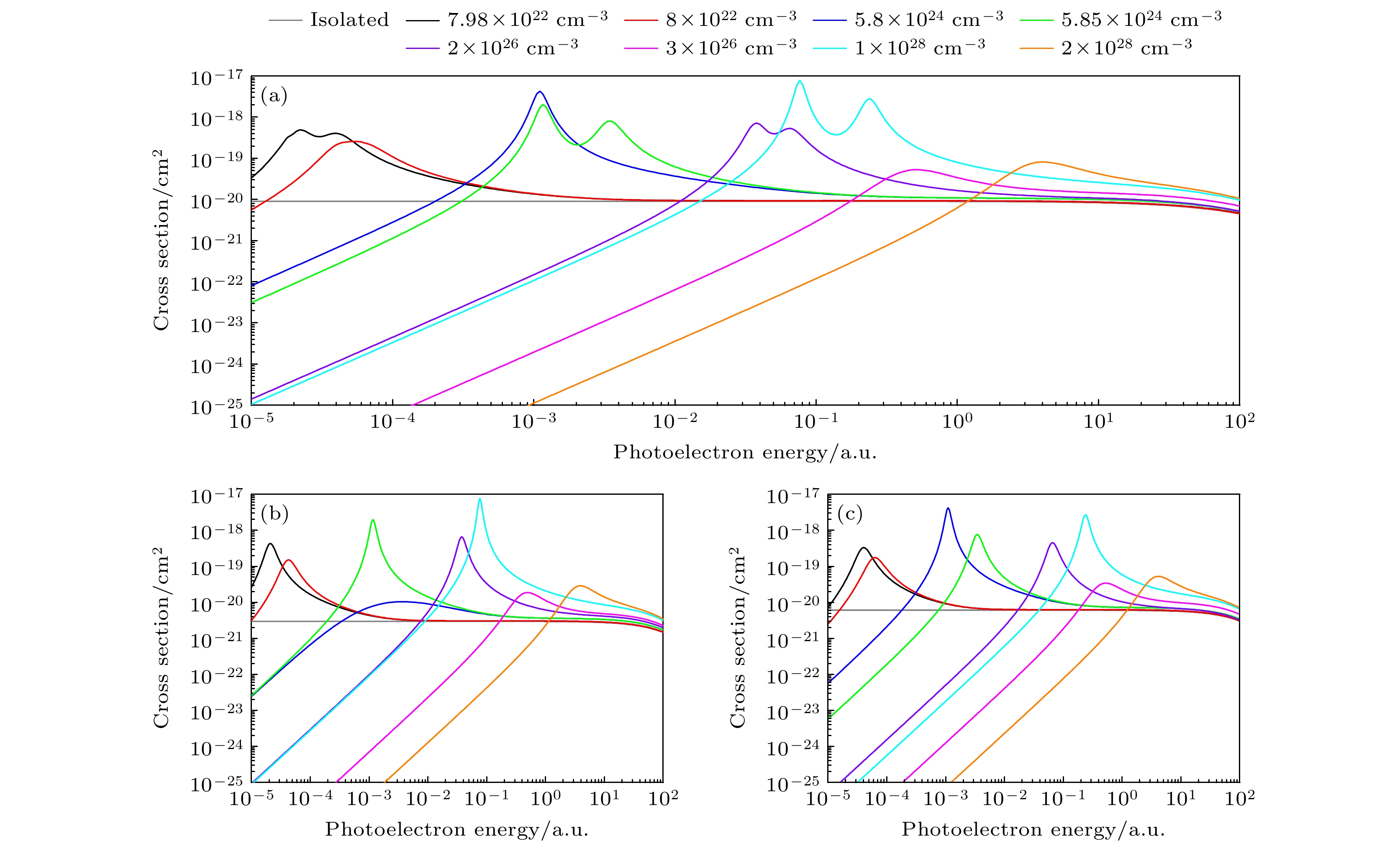 图 5 不同等离子体密度时Fe25+离子2s激发态的光电离截面 (a) 2s1/2总截面; (b) 2s1/2→εp1/2; (c) 2s1/2→εp3/2; 温度Te = 200 eV