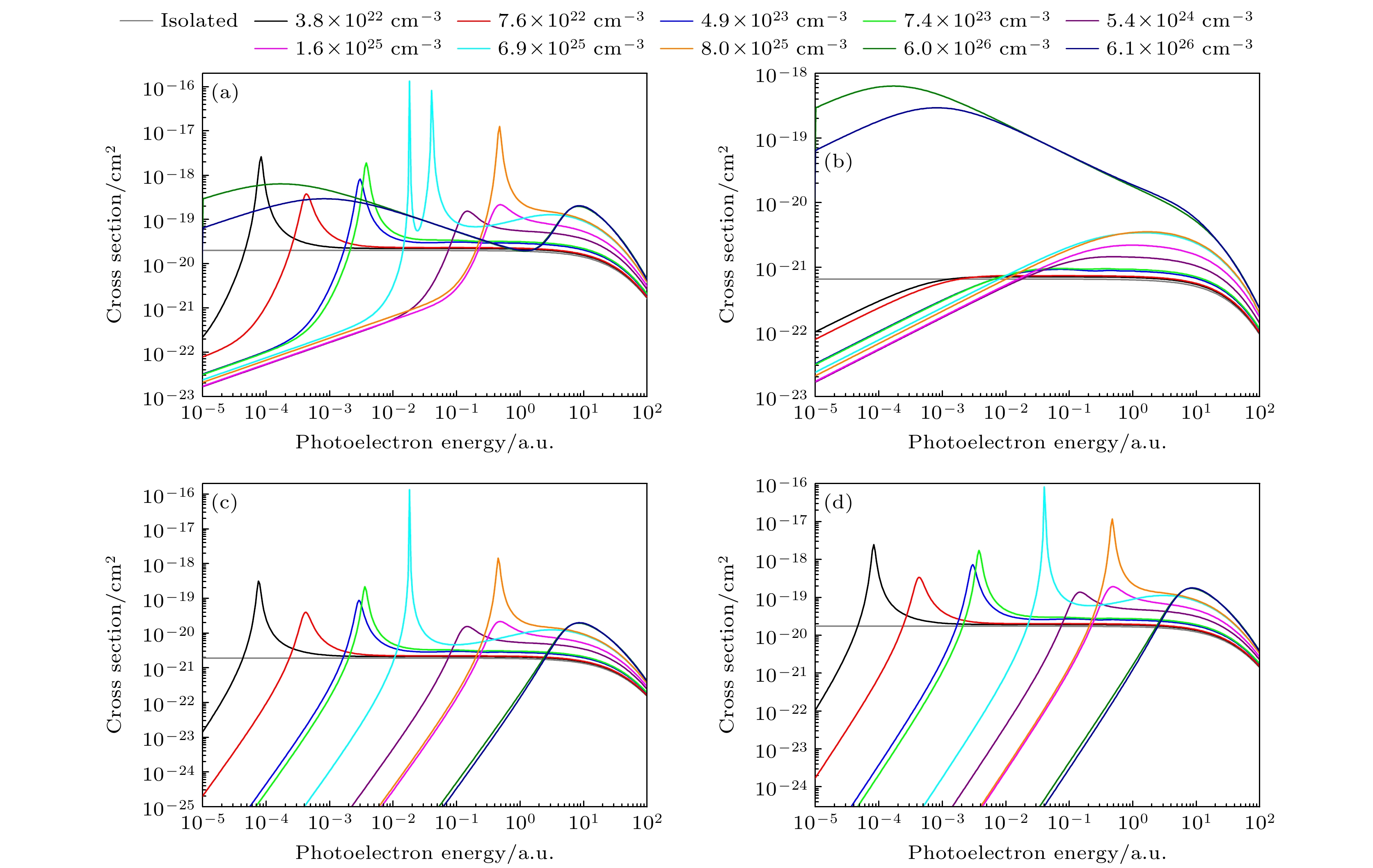 $ \sigma \propto {k^{2 l' + 1}} $ , 其中$ k = \sqrt {2\varepsilon } $ . 对于1s→εp1/2跃迁通道, l' = 1, 因此$ \sigma \propto {\left( {2\varepsilon } \right)^{3/2}} $ .图5所示为Fe25+离子2s激发态的光电离截面. 可以看到2s的光电离截面也出现了单峰和双峰的势形共振现象. 图中密度为5.83×1024 cm–3时, 2s→εp1/2和2s→εp3/2通道的截面在ε = 1×10–3 a.u.附近出现势形共振峰, 对应的εp1/2和εp3/2连续电子波函数在相同光电子能量处出现相位突变, 如图2所示. 同样, 密度为1.95×1026 cm–3时, 2s→εp3/2通道的截面在ε = 3×10–2 a.u.附近出现势形共振峰, 对应图2中连续电子波函数在该光电子能量附近出现相位突变. 此外能量较大时, 密度为7.99×1027 cm–3和9.80×1027 cm–3的截面出现了Cooper极小. Cooper极小出现在初态波函数节点数(n – l – 1)≥1的跃迁通道中, 且在临界值附近. 当密度大于临界值时, Cooper极小值经常与势形共振直接相关, 并在光电子能量高于离心势垒顶端时出现; 当密度小于临界值时, 由于ε(l + 1) 连续态的波函数在离心势垒顶端附近的相位发生改变, 只有Cooper极小值出现. 图5中2s截面中Cooper极小值出现的原因为: 初态束缚态波函数有1个节点, 影响偶极耦合矩阵元