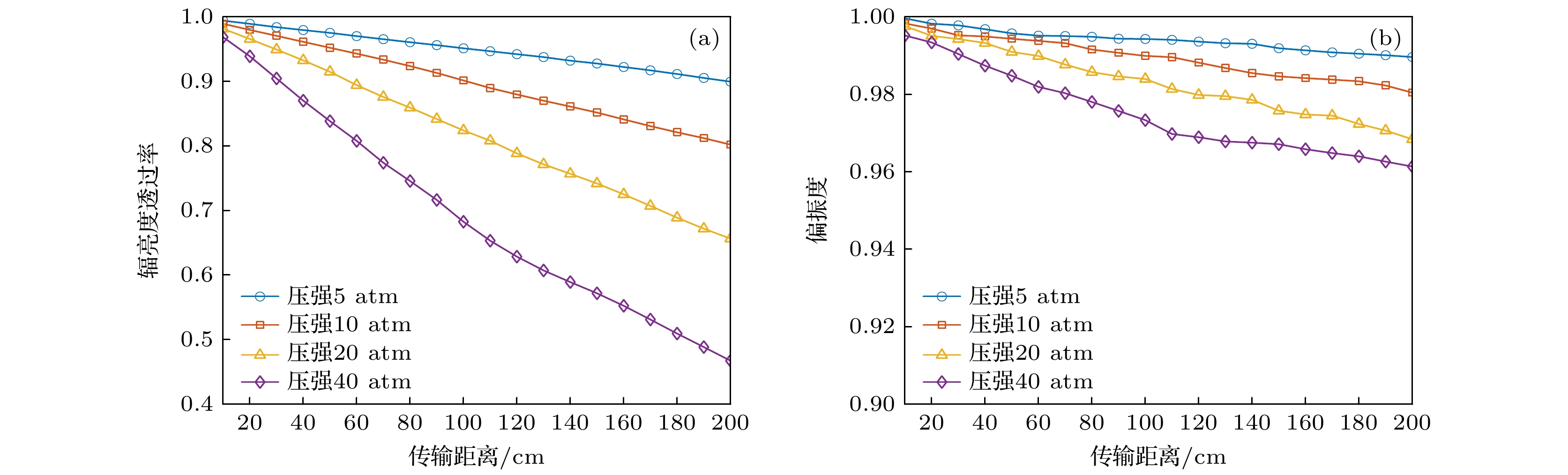 2)随着传输距离增大, 温度和压强对光波偏振辐射传输特性的影响更为显著. 压强与透过率和偏振度呈负相关, 温度的影响与气体的类型、温度范围等因素有关.