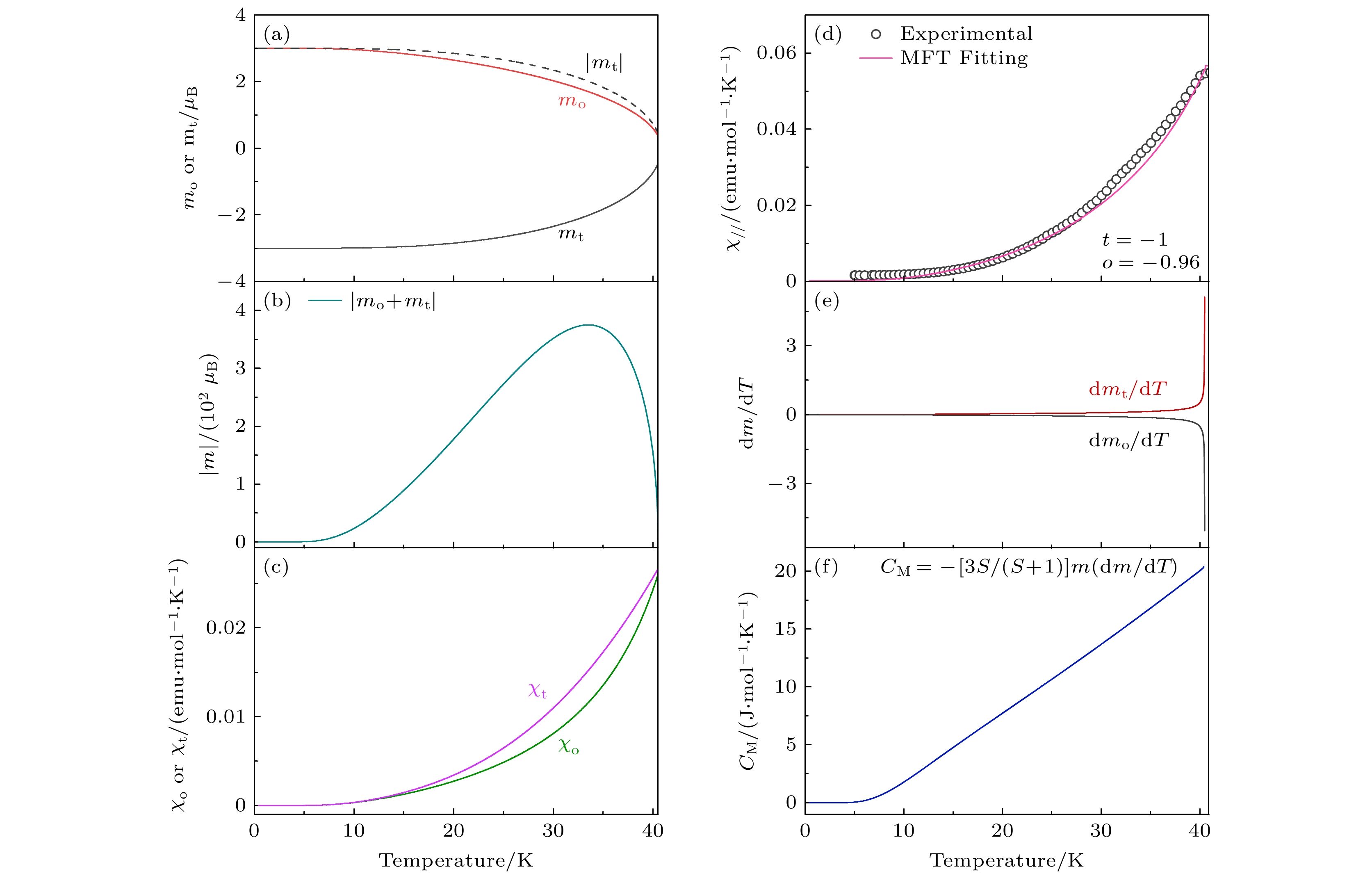 最后, 通过调节参数t和o的数值大小对χ(T )曲线进行拟合, 确定t和o大小分别取–1和–0.96拟合的曲线比较接近实验上观测的结果, 如图2(d)所示. 另外, 通过之前的中子散射实验可知四面体中Cot和八面体中Coo的磁矩大小分别为: 3.44 μB和3.35 μB, 两者的比值也非常接近t和o的取值. 总之, 可以看出t和o的取值, 在微观本质上和两个不同磁格子的磁矩大小是有关联的, 暗示了交换作用能的差异.