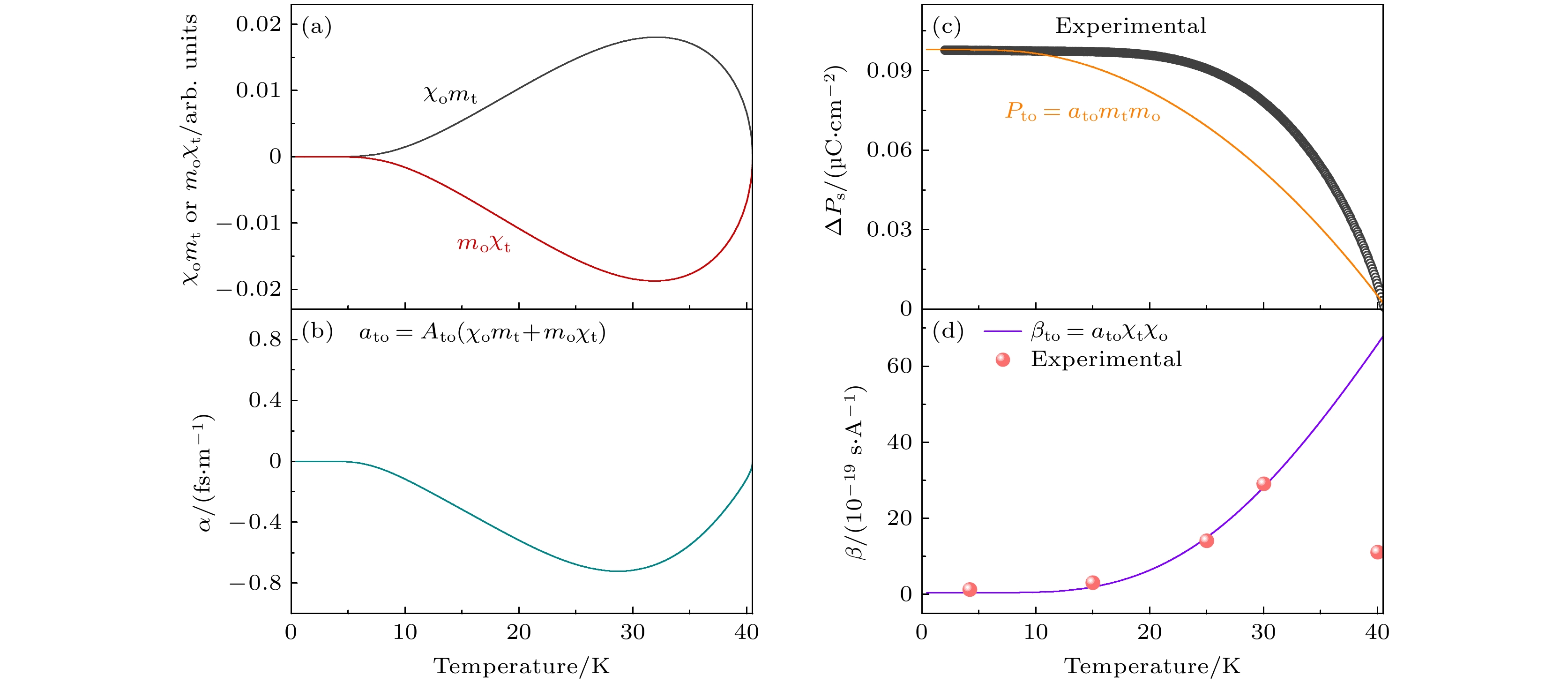 图 3 基于分子场近似, 得到的Co2Mo3O8 (a) χimj (i, j = t, o)、(b) 一阶线性磁电耦合系数、(c) 自旋诱导的铁电极化和(d) 二阶线性磁电耦合系数随温度的变化