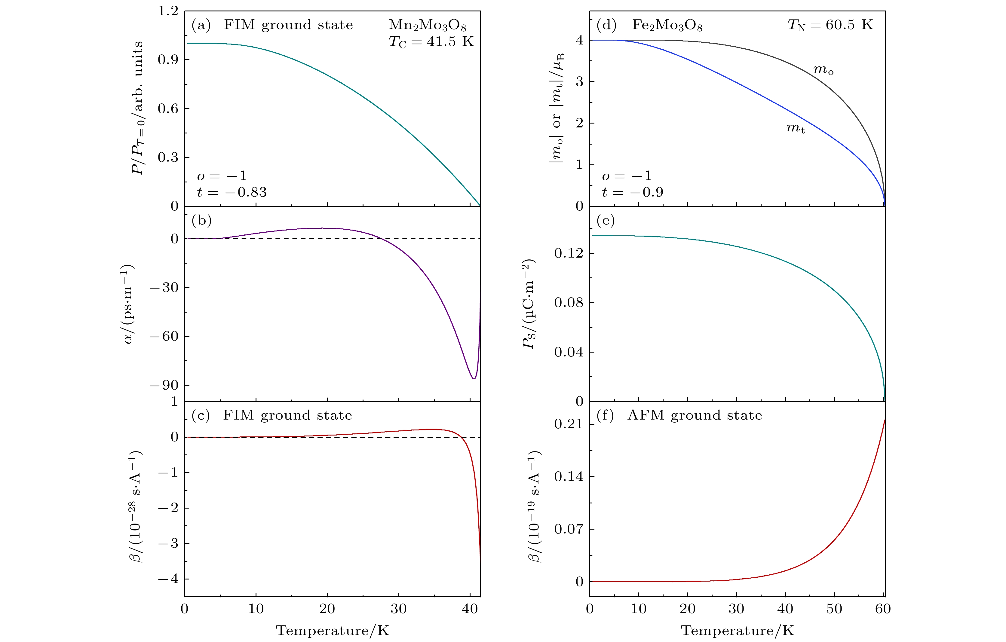 与Co2Mo3O8类似, 对于M2Mo3O8家族中的其他化合物Mn2Mo3O8和Fe2Mo3O8, 分别取不同的分子场系数[20,31], 得到不同自旋序诱导的自发极化、一阶线性磁电耦合系数和二阶非线性磁电耦合系数, 如图4(a)—(f)所示. 其中, 图4(a)—(c)展示Mn2Mo3O8的亚铁磁自旋序诱导的自发极化、线性磁电耦合系数和二阶非线性磁电耦合系数, 与之前Kurumaji等[20]报道的结果类似, 表明我们所建立模型的可靠性. 不同于反铁磁序的Co2Mo3O8以及Fe2Mo3O8, Mn2Mo3O8的一阶耦合系数比较大, 但其二阶耦合系数却是非常小. 对基态下反铁磁的Co2Mo3O8和Fe2Mo3O8, 其线性磁电耦合效应理论上是不存在的. 关于这一实验和理论上的差异, 主要是本文采用的计算模拟方法是基于唯象的分子场近似, 其中分子场理论是一个非常基础和常用的理论工具, 其将一个复杂的多体相互作用问题简化为一个单体在平均场(或等效场)中的问题. 对于反铁磁体, 这意味着每个磁性子晶格感受到的场是由其他子晶格的序参量(磁化强度)产生的平均场. 但是由于分子场理论中只考虑最近邻和次近邻的作用, 从而展现出较弱的一阶耦合效应, 但是它们的二阶耦合效应却是比较明显的, 且Co2Mo3O8的二阶耦合系数明显更大. 这也表明Co2Mo3O8磁性离子间的交换作用能可能比Fe2Mo3O8的更大, 因此在外界能量的扰动下更加稳定, 与之前实验中报道的Co2Mo3O8的多重磁矩和铁电极化转变的结果相对应[25].