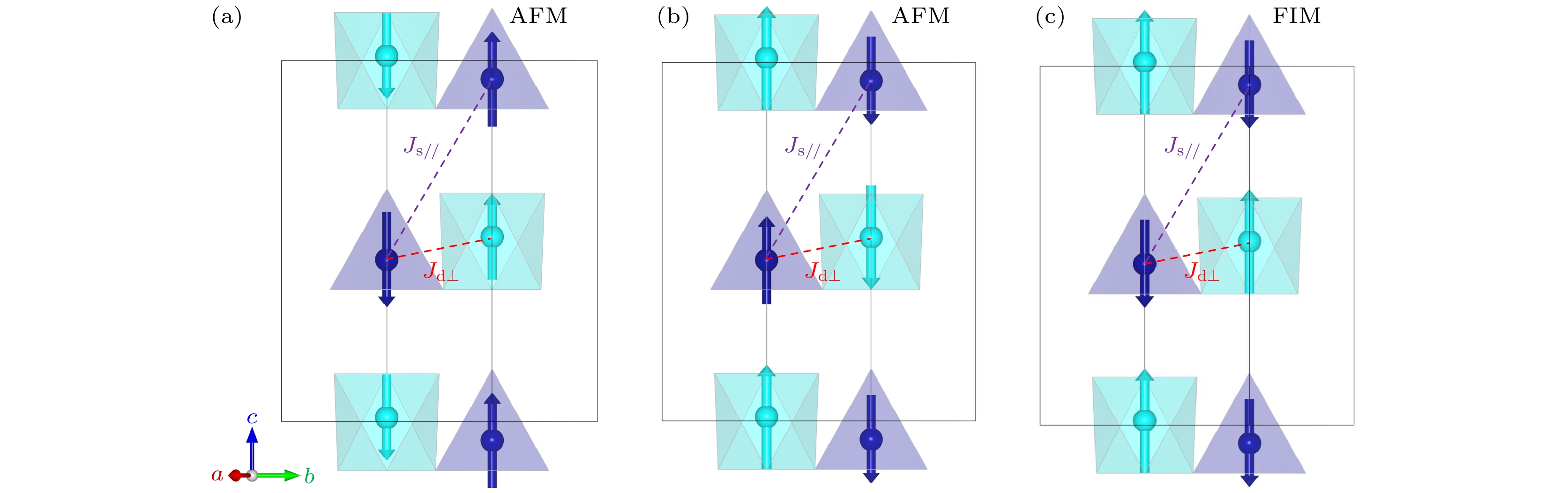 $ {\text{Co}}_{\text{t}}^{2 + } $ 与$ {\text{Co}}_{\text{o}}^{2 + } $ 离子的磁矩$ m_i^{2 + }(T) $ 随温度变化呈现非对称演化, 导致局域净磁矩的产生, 如图2(b)所示. 然而, 在单磁胞尺度下, 相邻Cot-Coo离子对的净磁矩呈反平行排列, 使得体系在基态下表现为反铁磁性, 这与Fe2Mo3O8基态下的特征一致[31].另外, 图2(c)展示了