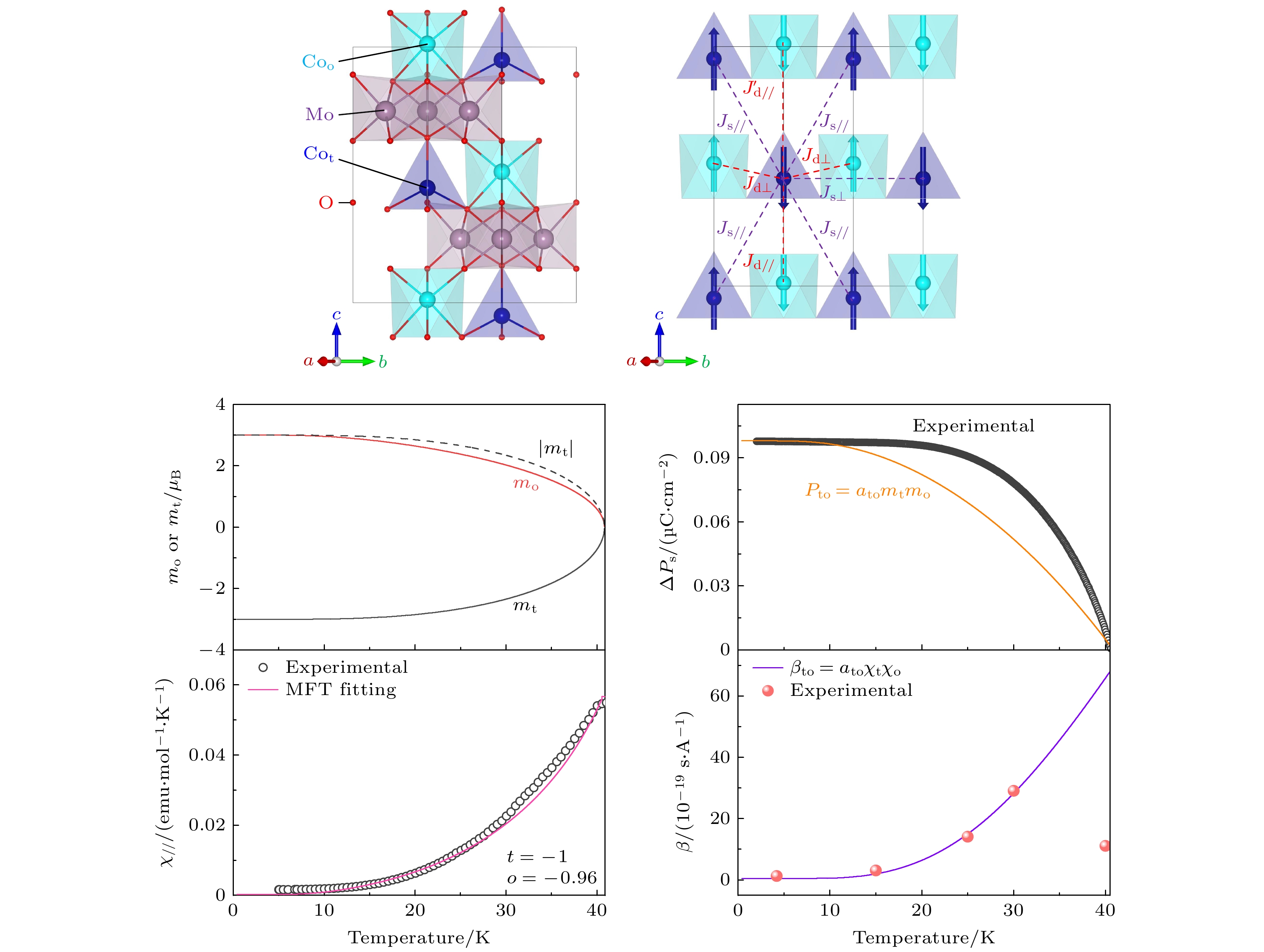 $ \lambda = 2{k_{\text{B}}}/{N_{\text{A}}}{g^2}\mu _{\text{B}}^2 $ 为归一化系数, 则对Co2+的高自旋态自旋量子数S = 3/2, 得J = 8.182 K, 进而得到氧四面体格子间的分子场系数为λt = Jλt = –8.182 K, 氧八面体格子的分子场系数为λo = Jλo = –7.854 K. 对于Mn2Mo3O8体系, 由Kurumaji等[20]报道可知, 相变温度TN = 41.5 K, 且Mn2+的高自旋态S = 5/2, 可得J = 3.717 K. 同理可得氧四面体和氧八面体的分子场系数为λt = –3.048 K, λo = –3.717 K. 最后, 对于Fe2Mo3O8体系, 由Solovyev等[31]报道可知, 对于Fe2+-Fe2+配置的电子结构, 通用取$ \lambda = 2{k_{\text{B}}}/{N_{\text{A}}}{g^2}\mu _{\text{B}}^2 $ 为归一化系数, 则其氧四面体和氧八面体的分子场系数为λt = –9.84 K, λo = –10.26 K[31].分子场近似展示的结果表明Co2Mo3O8体系中的自旋交换作用与同一家族体系中的其他材料之间存在明显的差异, 具体表现在: 首先, 对于基态下反铁磁的Co2Mo3O8体系, 两个不同配位中的钴离子的磁矩大小与Fe2Mo3O8相比, 差别较小. 两个最近邻反铁磁排列的钴离子之间有更大的交换作用能, 体系的磁电态更加的稳定. 其次, 与Mn2Mo3O8不同, Co2Mo3O8体系不同子格子间的反铁磁序使体系不存在一阶线性磁电耦合效应, 但是却拥有非常明显的抛物线行为的二阶非线性磁电耦合效应. 这种不可逆的磁电二极管(magnetoelectric diode)效应, 暗示了体系可能存在更广泛的潜在应用价值, 为磁电二极管(magnetoelectric diode)器件的发展了提供了坚实的实验基础[35,36].