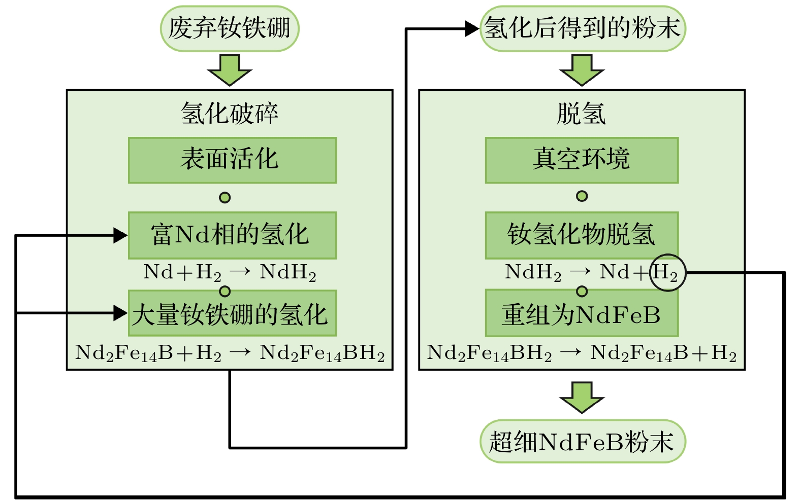 氢破(氢化-歧化-脱氢-重组)是一种用于加工稀土永磁材料的技术, 尤其是在回收和再生利用退役或废弃的磁体材料方面得到了广泛应用. 如图1所示, 将废弃钕铁硼材料放置在纯氢气氛中, 在晶界和三相点处开始形成氢化钕. 通过升高温度, 歧化反应也在这些区域开始, 然后传播到晶粒, 直到整个结构转变为Nd2Fe14BH2. 当压力降低至真空时, 氢气被脱附, 新的Nd2Fe14B晶粒开始重组和成核, 然后传播, 直到整个结构重新分布为超细Nd2Fe14B晶粒和富钕相[11,12].