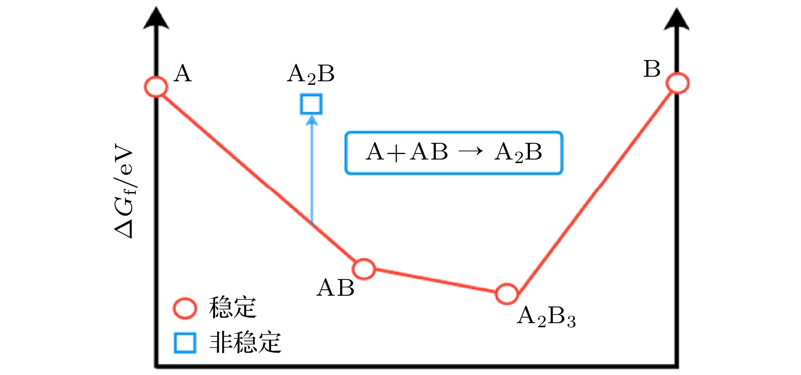 凸包分析的基本原理与吉布斯自由能最小化准则具有内在关联. 该方法通过构建给定化学组成点集的最小凸包(二维为凸多边形, 三维为凸多面体), 判断特定材料是否可通过分解为更稳定相的组合实现能量降低. 基于计算几何算法构建的凸包边界对应热力学稳定相, 而凸包外部区域表征亚稳或不稳定相. 基态DFT计算, 不包括温度效应(例如, 熵效应, 热膨胀), 因此热力学势只是总(内部)能, 但如果考虑温度效应, 那么热力学势应该为吉布斯自由能. 当某材料的形成能精确位于凸包边界时, 表明其能量状态已达到该化学组成下的最小值, 具备热力学稳定性. 反之, 若形成能位于凸包外, 则暗示材料可能通过相分离或组分重组向能量更低的稳定相演化. 以A2B相为例, 其形成能高于凸包边界对应的单质A与AB相组合, 预示该相存在自发分解倾向[31].