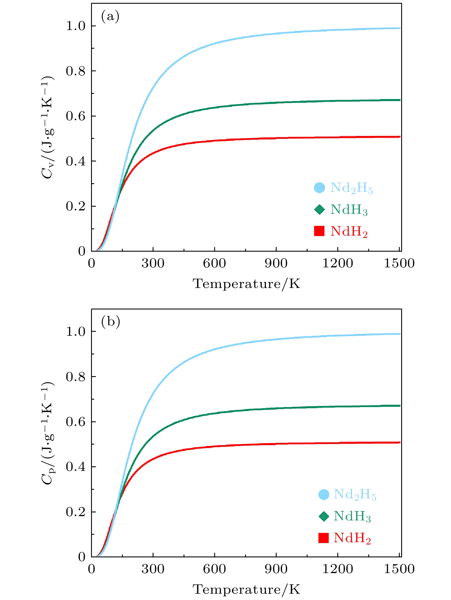 $ {{C}_{{\mathrm{v}}}}\approx 3 n{{k}_{{\mathrm{B}}}} $ , 即比热容趋近于常数. 在低温下, 只有较低频率的声子能被激发. 此时, 比热容呈现出$ {{C}_{{\mathrm{v}}}}\approx 9 n{{k}_{{\mathrm{B}}}}{{\left( {T}/{{{\theta }_{{\mathrm{D}}}}} \right)}^{3}} $ 的依赖关系, 在这一温度范围内, 比热容随着温度的三次方增大. 比热容是物质吸收或释放热量时温度变化的程度, 具体来说, 比热容越小, 物质在吸收或释放相同热量时温度变化越大. 根据计算结果, 对于比热容最小的NdH2, 其在氢破过程中温度变化相较其他相会更显著. 钕氢化物在加热过程中会吸收热量并发生脱氢反应. 比热容较小的NdH2在吸收热量时, 其温度会比比热容大的物质(如NdH3, Nd2H5)上升得更快. 这意味着NdH2能够更快速地升温, 从而加快氢化物的脱氢反应, 缩短反应时间. 此外, 由于较小的比热容, NdH2在相同热量输入下能产生更大的温度变化, 这有助于更高效地利用输入的热量, 减少能源浪费, 从而提高回收过程的能效. -