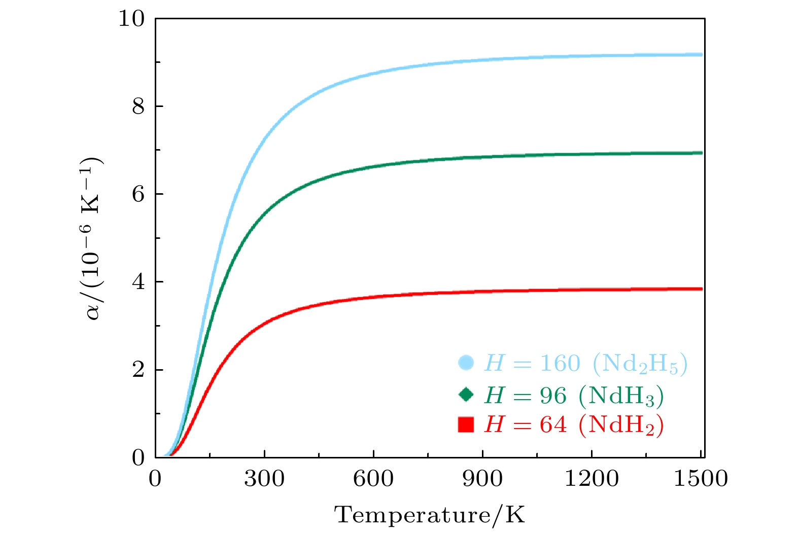 为了确保计算的准确性, 体积数据经过了适当的单位转换, 并结合温度变化使用数值微分方法对热膨胀系数进行求解, 分别得到了NdH2, NdH3以及Nd2H5的热膨胀系数随温度的变化情况, 如图4所示. 热膨胀系数随温度变化的趋势可以通过理论分析得到合理解释. 如图4所示, 热膨胀系数