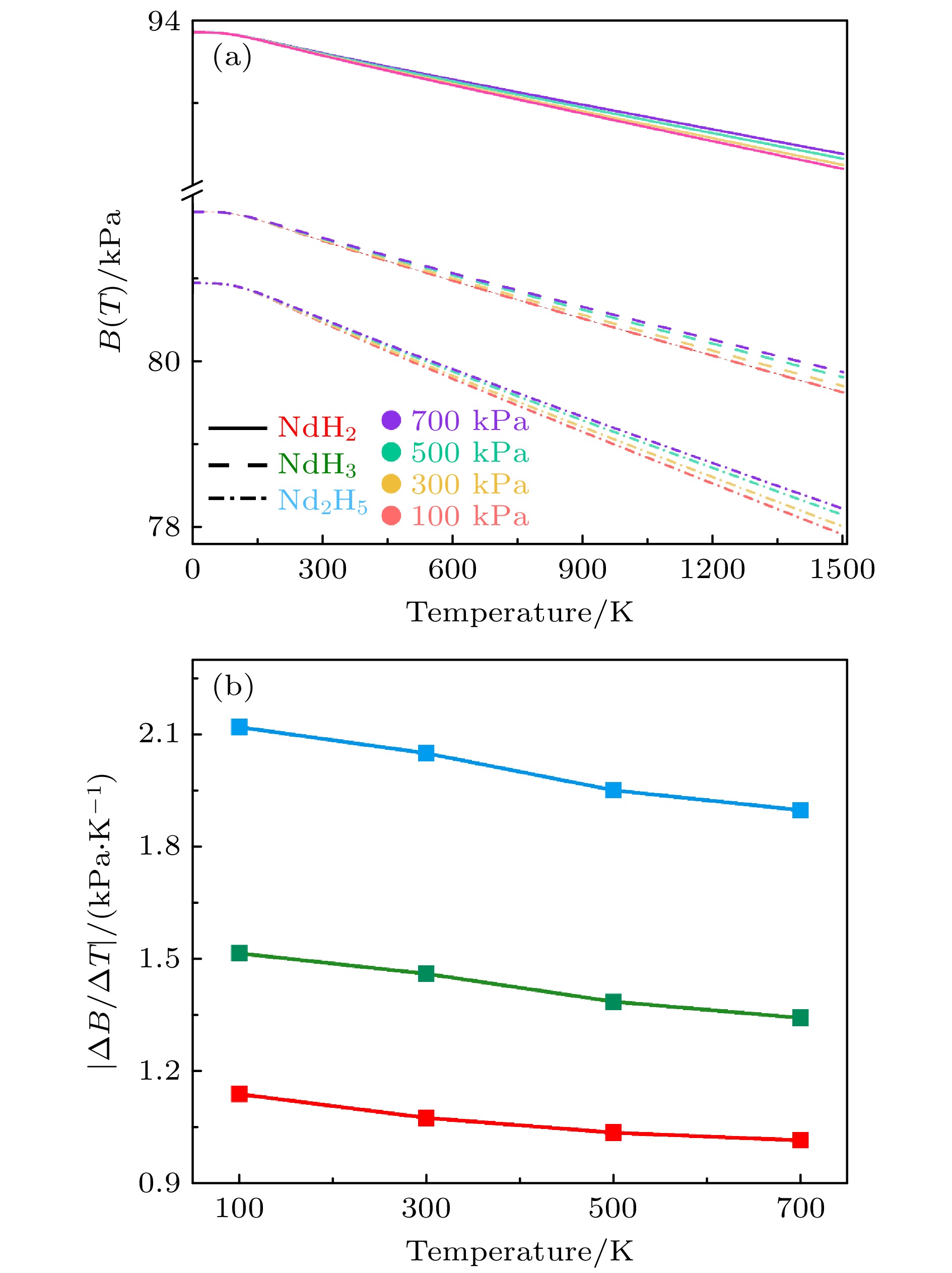 $ \left(\left| {\partial B}/{\partial T} \right| \right) $ 的线状图Figure 5. Variation of isothermal elastic modulus with temperature and pressure: (a) Variation curves of isothermal elastic modulus with temperature for NdH2, NdH3, and Nd2H5 under pressures of 100, 300, 500, and 700 kPa, respectively; (b) line graph of the absolute value
