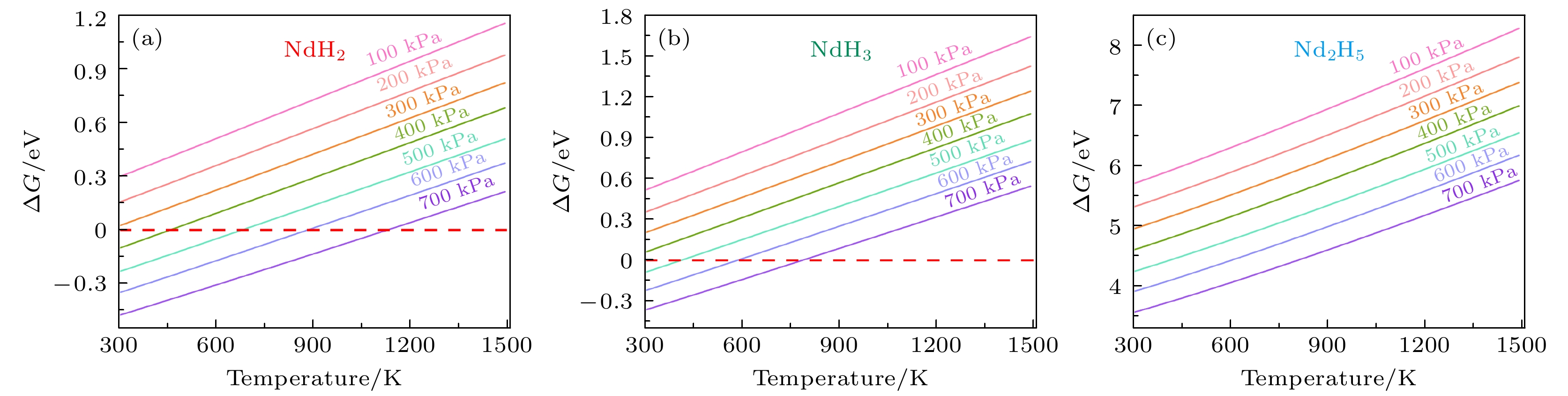 将废弃钕铁硼材料放置在纯氢气氛中, 在晶界和三相点处开始进行氢化反应, 形成氢化钕. 钕氢化物有3种, 其中最稳定的是NdH2, 但在某些情况下, 如H2浓度高, 也会出现其他的钕氢化物, 包括Nd2H5和NdH3[13-15]. 因此(2)式中的x取决于温度和压强[16]. 目前完整的氢化钕的热力学信息特别是Nd2H5和NdH3的热力学信息仍然匮乏, 很难对完全氢化进行进一步的热力学评价[17]. 因此, 我们首先需要计算并获得氢化过程可能会形成的钕氢化物的热力学信息.