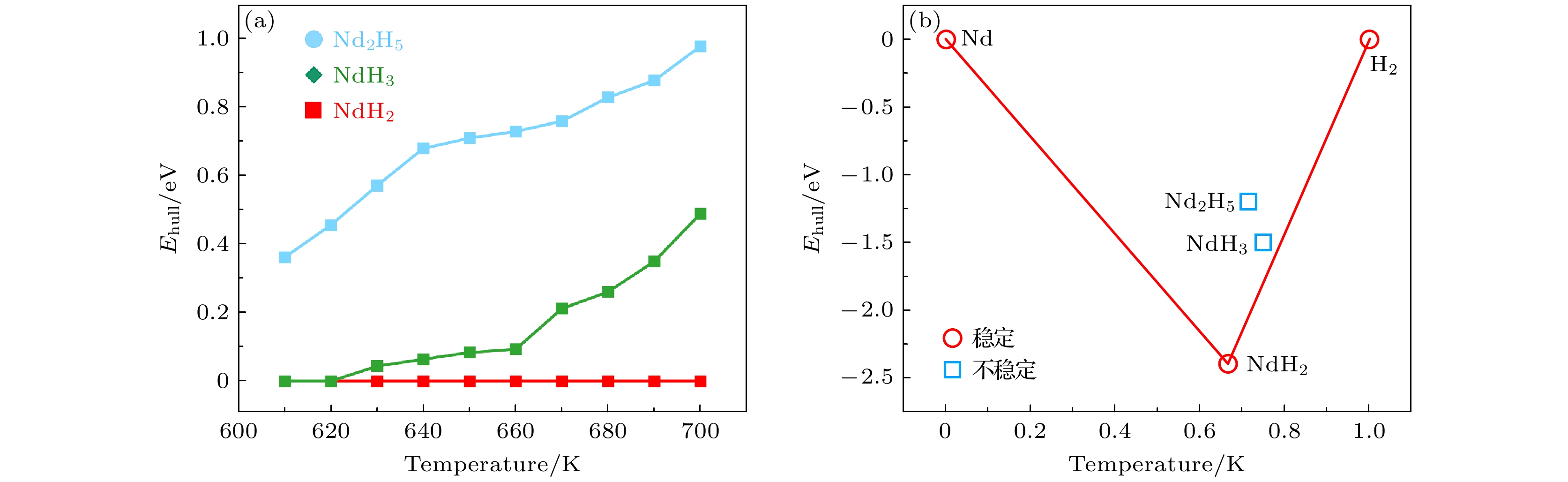 $ {\Delta_{{\mathrm{f}}}}G $ )的变化规律见图7.$ {\Delta_{{\mathrm{f}}}}G $ 随着温度的升高而增大, 这一现象表明, 随着热能的增大, 系统中的反应趋向于更为不稳定的状态, 导致氢化物的形成变得更加困难. 在热力学上,$ {\Delta_{{\mathrm{f}}}}G $ 的增大通常与反应的自发性下降相关, 即需要更多的外部能量来推动反应进行. 对于3种氢化物来说, NdH2的$ {\Delta_{f}}G $ 最小, 表明其相较于其他相在热力学上最容易形成. NdH3次之, 而Nd2H5的$ {\Delta_{f}}G $ 最大, 意味着Nd2H5在热力学上最不稳定且不容易形成. 除了温度, 压强对$ {\Delta_{f}}G $ 也起到了显著的影响. 随着压强的增大, 3种氢化物的$ {\Delta_{{\mathrm{f}}}}G $ 均出现下降趋势. 这是因为在较高的压强下, 氢气的浓度增大, 氢化物的形成更加有利, 从而使得反应的自由能降低, 氢化物的生成过程更加自发. 在所有压强条件下, NdH2的$ {\Delta_{f}}G $ 仍然最小, NdH3较大, 而Nd2H5的则是最大的. 如图7(a)所示, 压强条件小于等于300 kPa时, NdH2在所计算的温度范围内都难以自发形成, 同理, 如图7(b), 在压强条件小于等于400 kPa时难以自发形成NdH3. 通过对比图7(a), (b)可以发现, 要生成NdH2相而抑制NdH3, Nd2H5相的产生(主要抑制NdH3相, 因为Nd2H5相在所考虑的温度和压强范围内的吉布斯形成能都过大), 温度和压强条件可以综合考虑为300 kPa的压强条件, 300 K的室温条件, 400 kPa的压强条件下, 温度小于460 K, 500 kPa的压强条件下, 温度区间为420—690 K, 600 kPa压强条件下, 温度区间为590—890 K, 700 kPa压强条件下, 温度区间为830—1130 K. Piotrowicz等[41]实验的结果表明, 氢吸收量随压力的增大而增大, 同时工艺持续时间缩短. 实验表明, 在 200—400 kPa的压力范围内和低于100 ℃的温度下, Nd2Fe14B磁体能够实现完全解体. 此外, Xia等[42]实验中发现, 在室温和450 kPa的压强条件下, Nd2Fe14B磁体氢化破碎成粉末. 而Li等[16]研究观察到, 当氢压超过500 kPa时, 氢含量开始增大, 更高的压强有助于氢吸收. 压强不足可能导致氢化不完全, 从而降低粉末的各向异性程度, 并导致不充分的氢 破裂以及多晶颗粒的形成. 这些氢破裂 (HD) 实验工艺条件提供的温度和压强操作范围落在我们计算得到结果范围内, 然而, 实验并未明确指出实现最佳回收效果的精确条件. 为了确定最优参数, 需结合3种钕氢化物的凸包图, 确保即使NdH3和Nd2H5相形成, 也难稳定存在, 并最终分解为NdH2相, 对氢化物相转变的精细控制, 对于显著提升稀土元素的回收效率、优化其纯度及后续的再利用价值具有重要意义.如图8所示, 根据计算结果, 温度小于620 K, NdH2和NdH3这两个相是稳定存在的, Nd2H5处于非稳定状态. 当温度大于等于630 K时, NdH2稳定而NdH3处在凸包图之外, 从这个温度开始, NdH3便处于非稳定状态. 而Nd2H5的形成能过高, 因此在所计算的温度范围内(300—1500 K)都不稳定, 极易被分解成其他相. 综上, 避免形成NdH3相和Nd2H5相的温度需要大于630 K左右, 同时满足600 kPa的压强条件. 不过结合NdH2的其他热力学性质, 温度越高, 等温弹性模量、热导率以及热扩散系数都下降, 因此, 温度不是越高越好, 在630 K左右最佳, 并且, 600 kPa的压强条件有助于氢吸收, 避免氢化的不完全导致的回收效率降低.