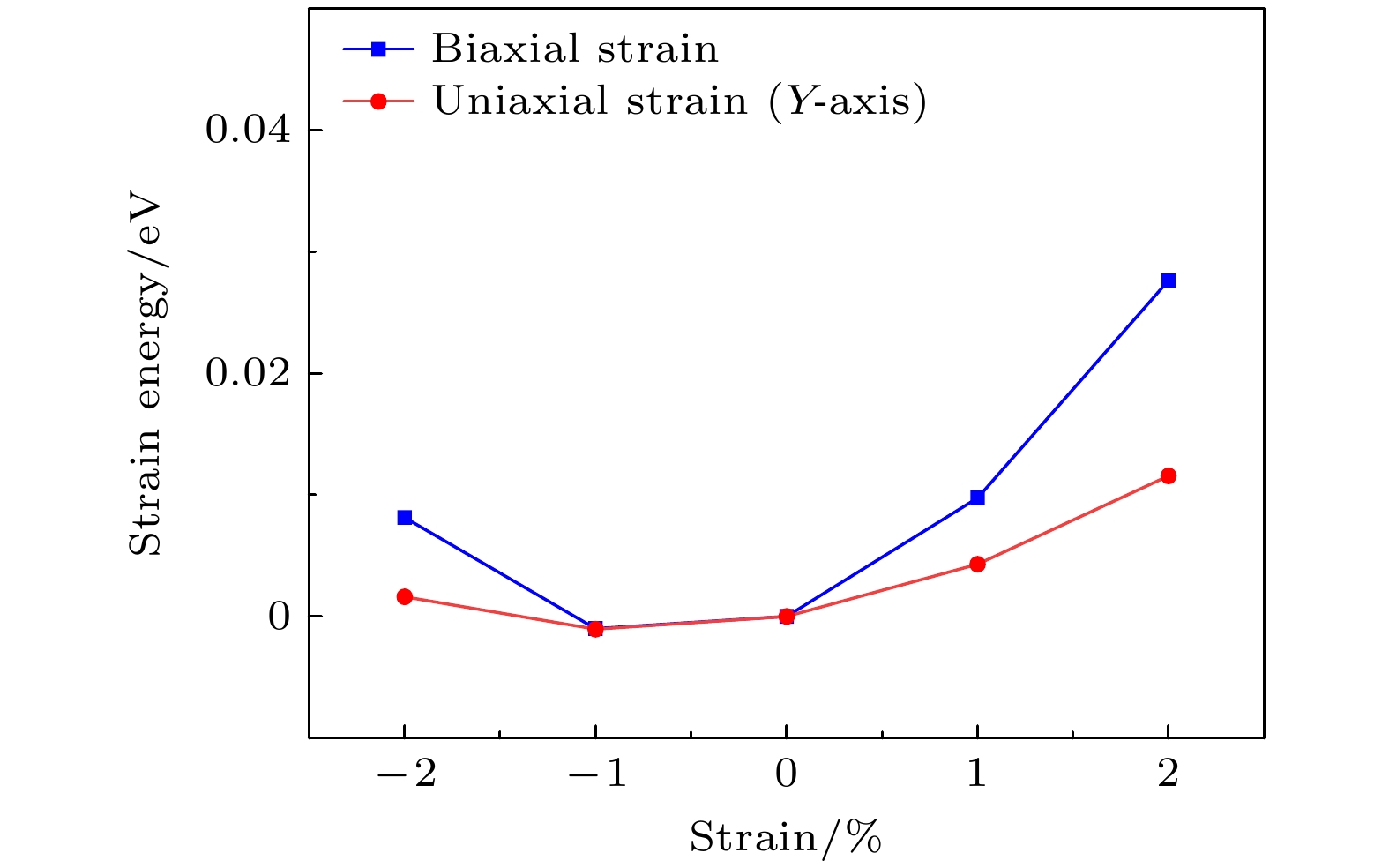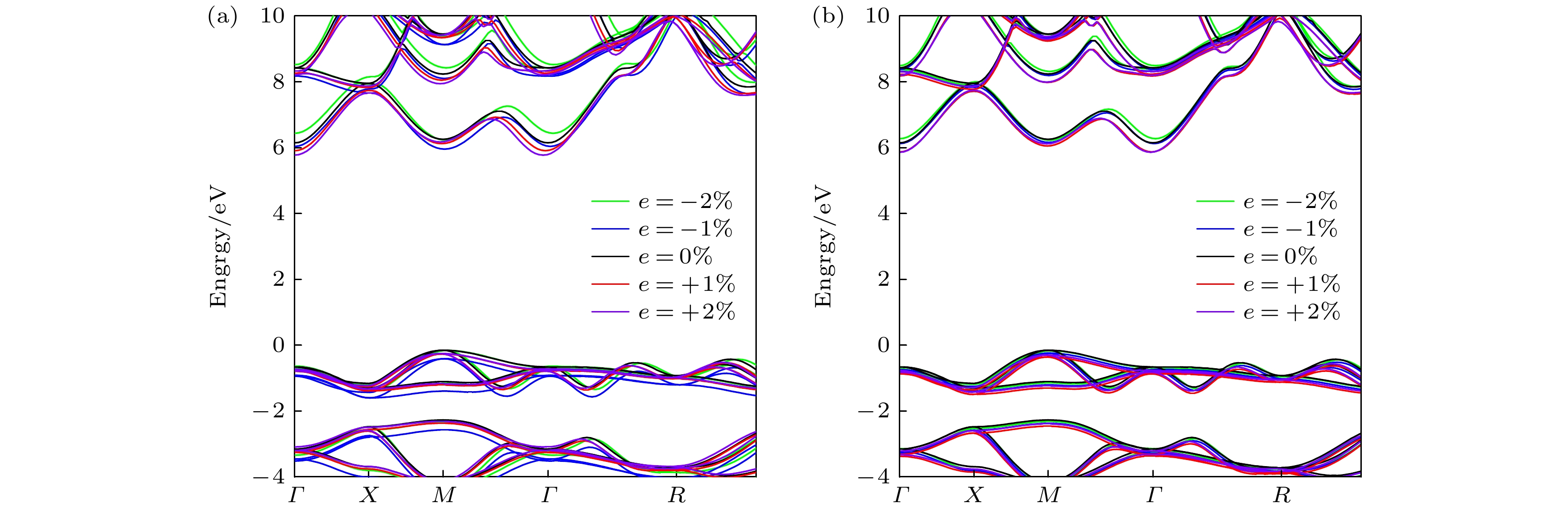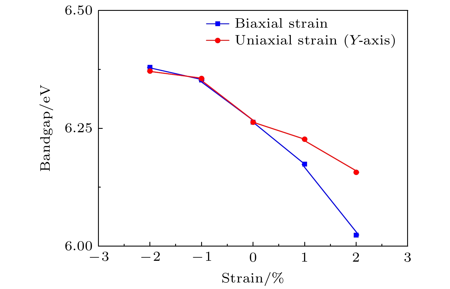 图5给出了Li3OCl在双轴/单轴应变下带隙随应变量的变化情况. Li3OCl的带隙对拉伸应变的敏感性高于压缩应变. 随着双轴拉伸应变由e = 0增加到e = 2%, 带隙由6.263 eV减小到6.023 eV; 随着双轴压缩应变由e = 0增加到e = –2%, 带隙由6.263 eV增加到6.380 eV. 对于单轴应变, 带隙的变化趋势与双轴应变类似, 但变化的幅度和敏感性有所不同. 在单轴拉伸应变下, 带隙也呈现下降趋势, 但下降的幅度较双轴应变更为平缓.