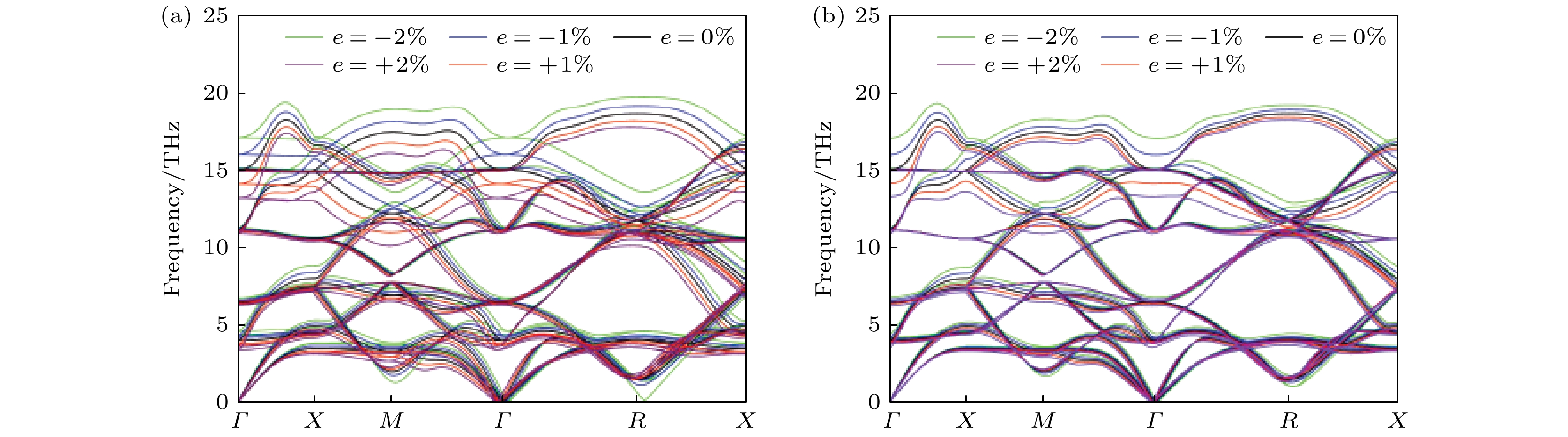 我们研究了Li3OCl的弹性应变范围及其对压缩应变和拉伸应变的响应特性. 研究表明, 应变能与双轴应变之间呈现显著的二次关系, 这一发现充分体现了系统固有的结构柔性. 图2为Li3OCl晶体的应变能随双轴应变和单轴应变的关系. 模拟实验中, 将施加的应变e范围设定在–2%至2%之间. 我们计算了–2%至2%范围内双轴与单轴应变下的声子色散关系(图3), 未出现虚频, 表明在此应变范围内结构是稳定的.