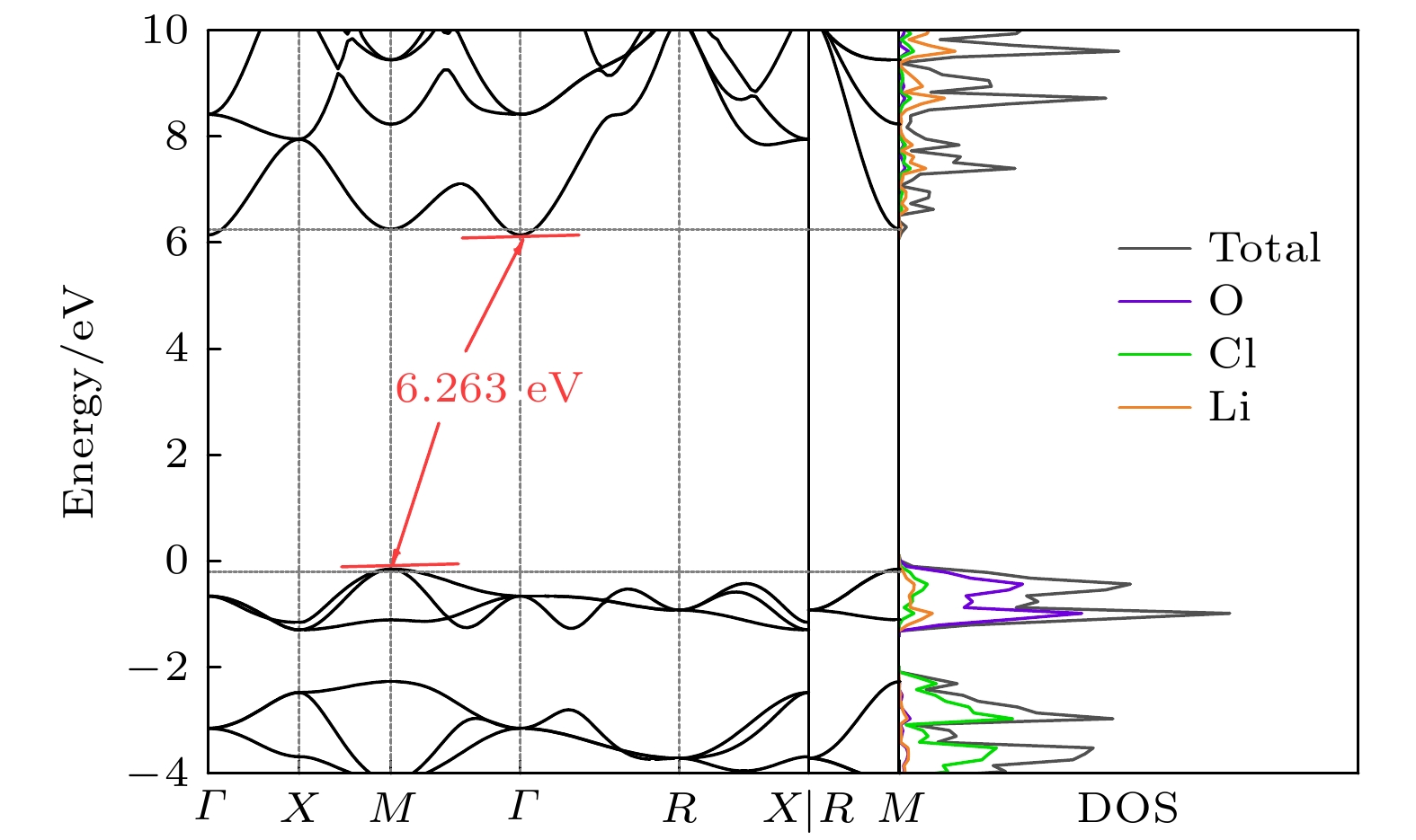 当固体电解质的带隙与电池的电压范围相匹配时, 才是有效的电解质. 由于高压阴极工作在4 V左右[35], 大于5 eV的带隙被认为适合用于锂离子电池[36]. 图4给出了无应变的Li3OCl的电子能带结构和态密度(density of states, DOS). 电子能带结构计算显示价带顶和导带底分别位于M点和Γ点, 间接带隙为6.263 eV, 这与Wu等[21]计算的间接带隙值(6.26 eV)十分吻合. Li3OCl的带隙对晶格常数非常敏感, 当Li3OCl的晶格常数略微压缩至3.865 Å时, 变为直接带隙且带隙值为6.46 eV. 因此, Li3OCl是一种宽禁带的绝缘体, 具有良好的电化学稳定性.