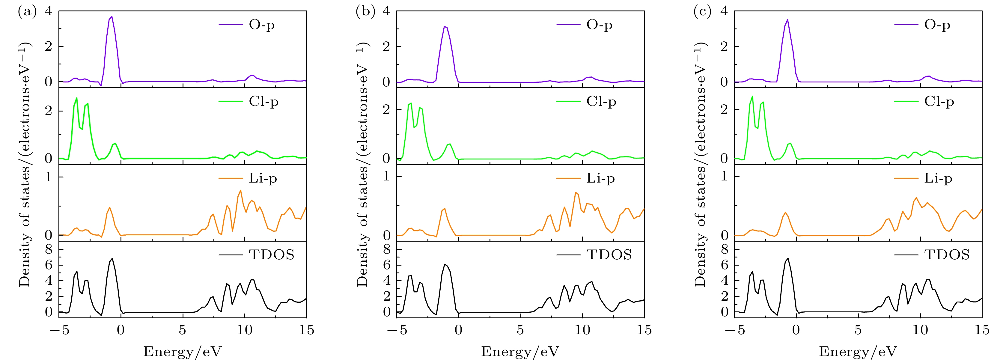我们发现施加–2%的双轴压缩应变后的Li3OCl, 其光吸收系数、介电函数、折射率和反射率均达到最高值. 从态密度分析可以看出, 施加–2%的压缩应变后的Li3OCl在价带和导带附近存在更为密集的电子态分布, 主要由Li原子贡献; 同时Cl和O原子在费米能级附近呈现出更显著的态密度峰. 这种电子结构特征显著增强了Li-p, O-p和Cl-p轨道之间的跃迁概率, 使得光子受激跃迁时的数量更多, 从而大幅提升了材料的光吸收强度.