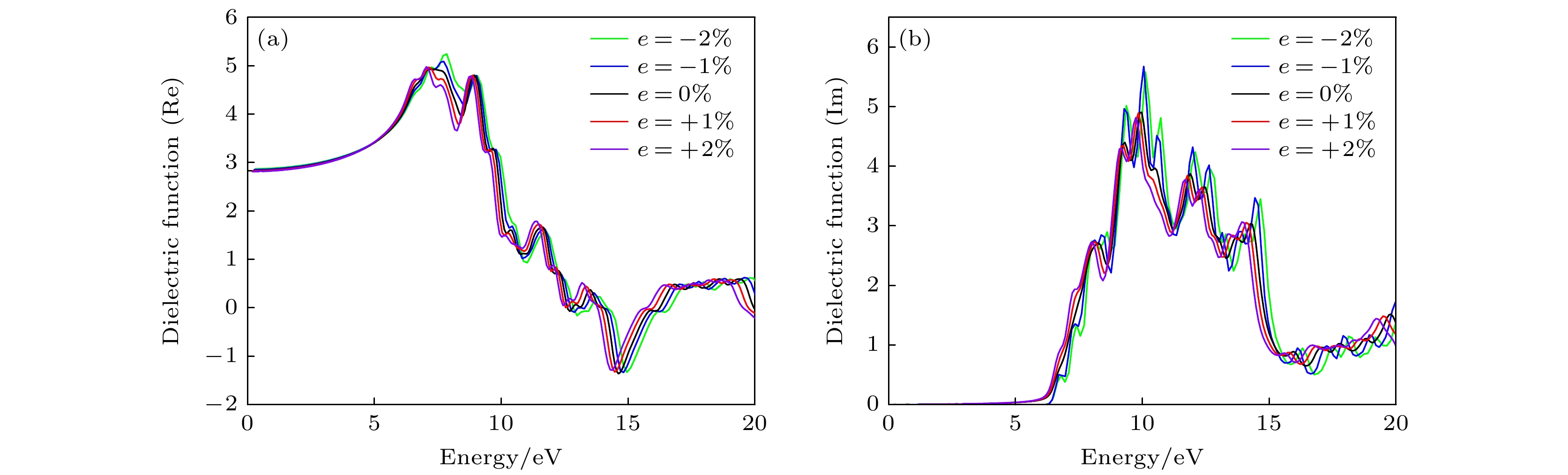 介电函数的虚部如图8(b)所示, 其反映了材料对光的吸收程度, 其值的大小与电子跃迁的强度有关. 无应变时, 当外场能量大于6.26 eV后, ε2迅速上升, 并在外场能量为9.97 eV处达到峰值4.90, 随后ε2逐渐下降, 在频率为15 eV趋于稳定. 相比于无应变情况, 当施加双轴拉伸应变时, ε2的吸收带红移.
