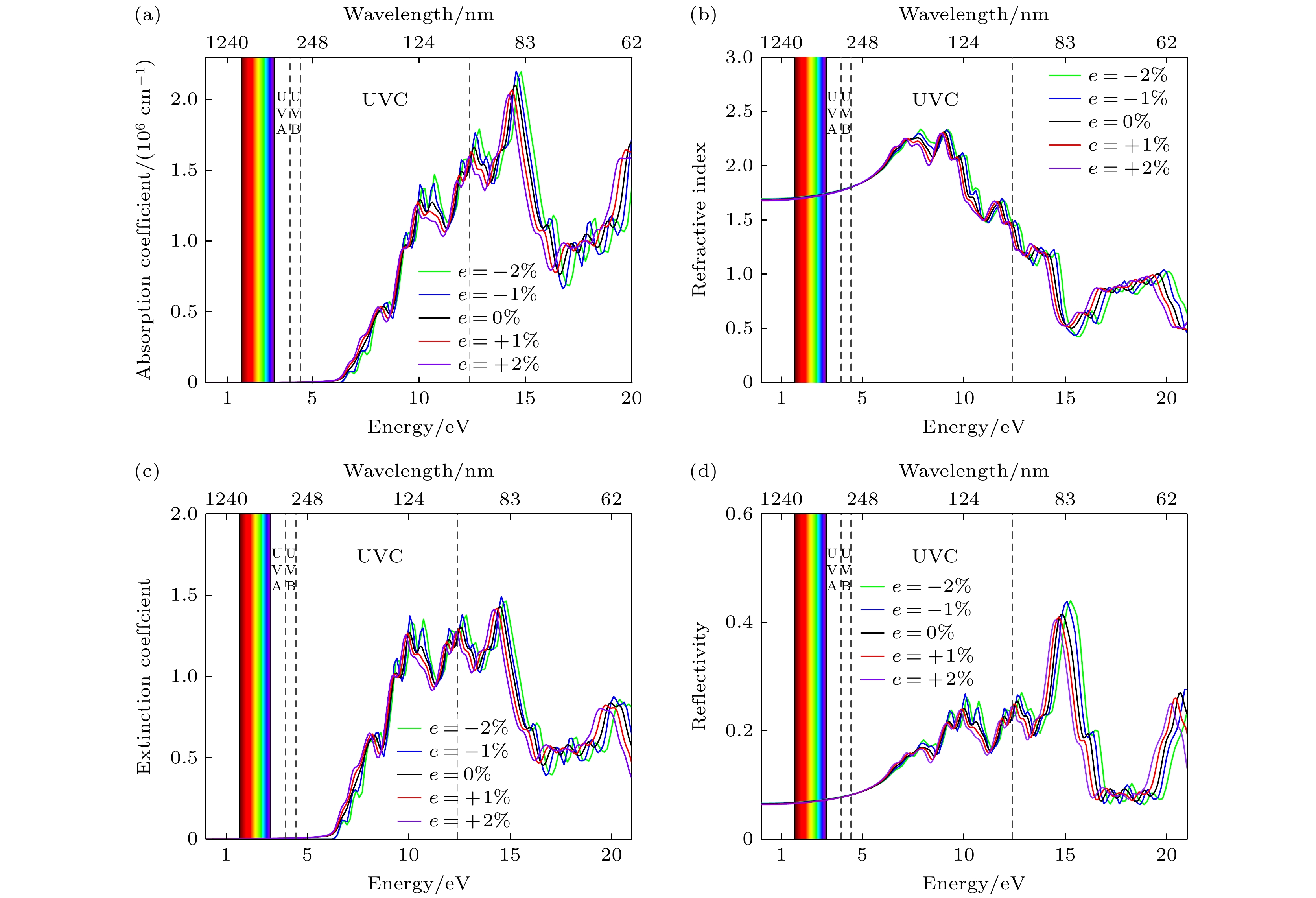 对于带隙大的材料, 只有当光的能量足够高时, 消光系数才会显著增大, 即才会具有明显的消光系数. 由图9(c)所示, 我们发现在光子能量增加的过程中, 由于2%拉伸应变下的带隙最小, 因此最先在较低的光子能量下具有消光系数. 消光系数在8.43到12.74 eV之间保持较为稳定且大于1, 说明Li3OCl在紫外区域(UVC)对光的衰减能力较强. 施加双轴拉伸应变后, 消光系数表现出明显的红移现象, 且峰值略微下降. 而施加双轴压缩应变后, 消光系数表现出明显的蓝移现象, 且峰值略微上升. 图9(d)显示了Li3OCl的反射特性, 无应变状态下Li3OCl在紫外区表现出较强的反射特性, 双轴拉伸应变使反射峰红移且反射强度略有下降, 而压缩应变作用使反射峰蓝移且反射强度略有上升.