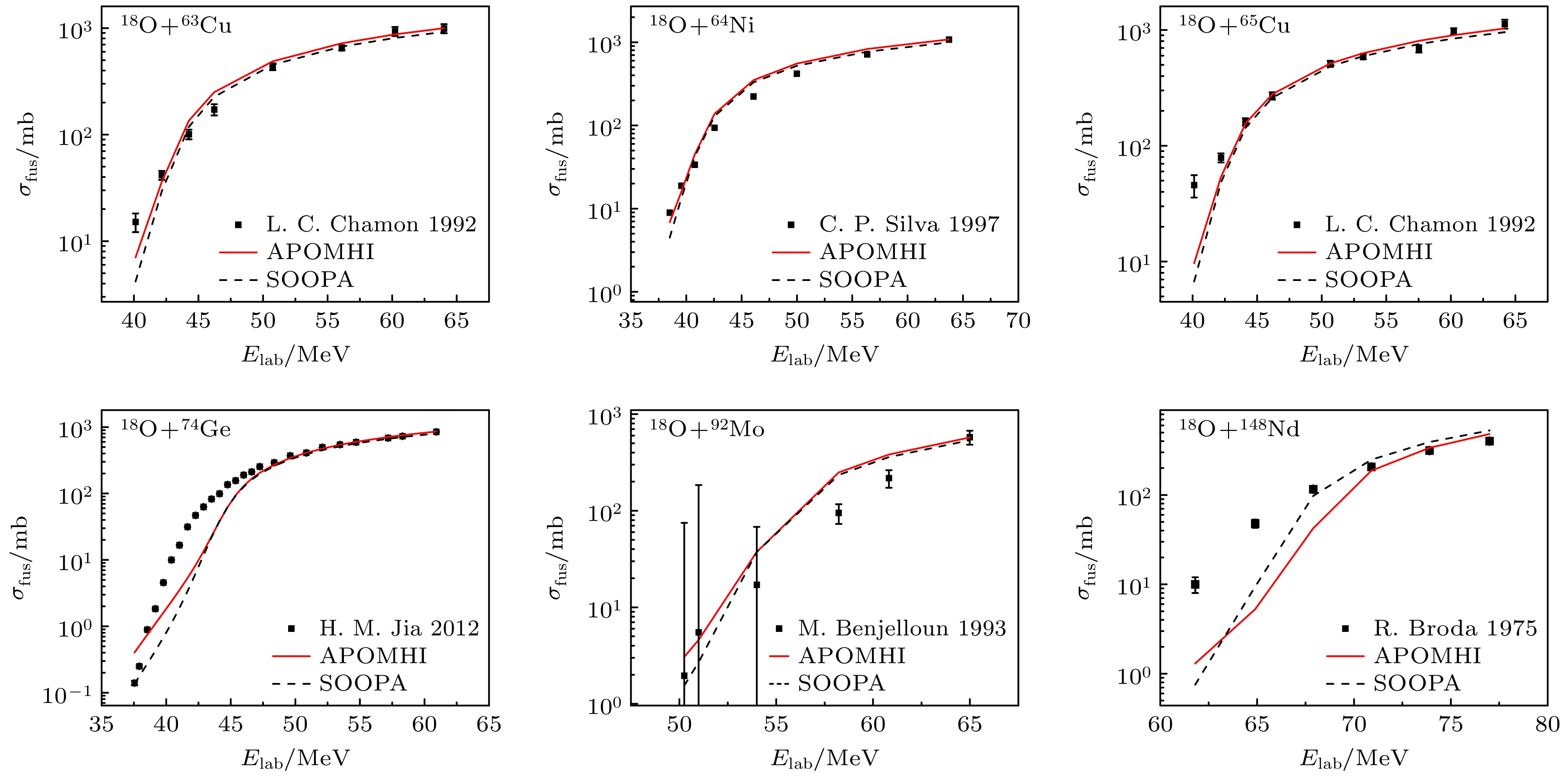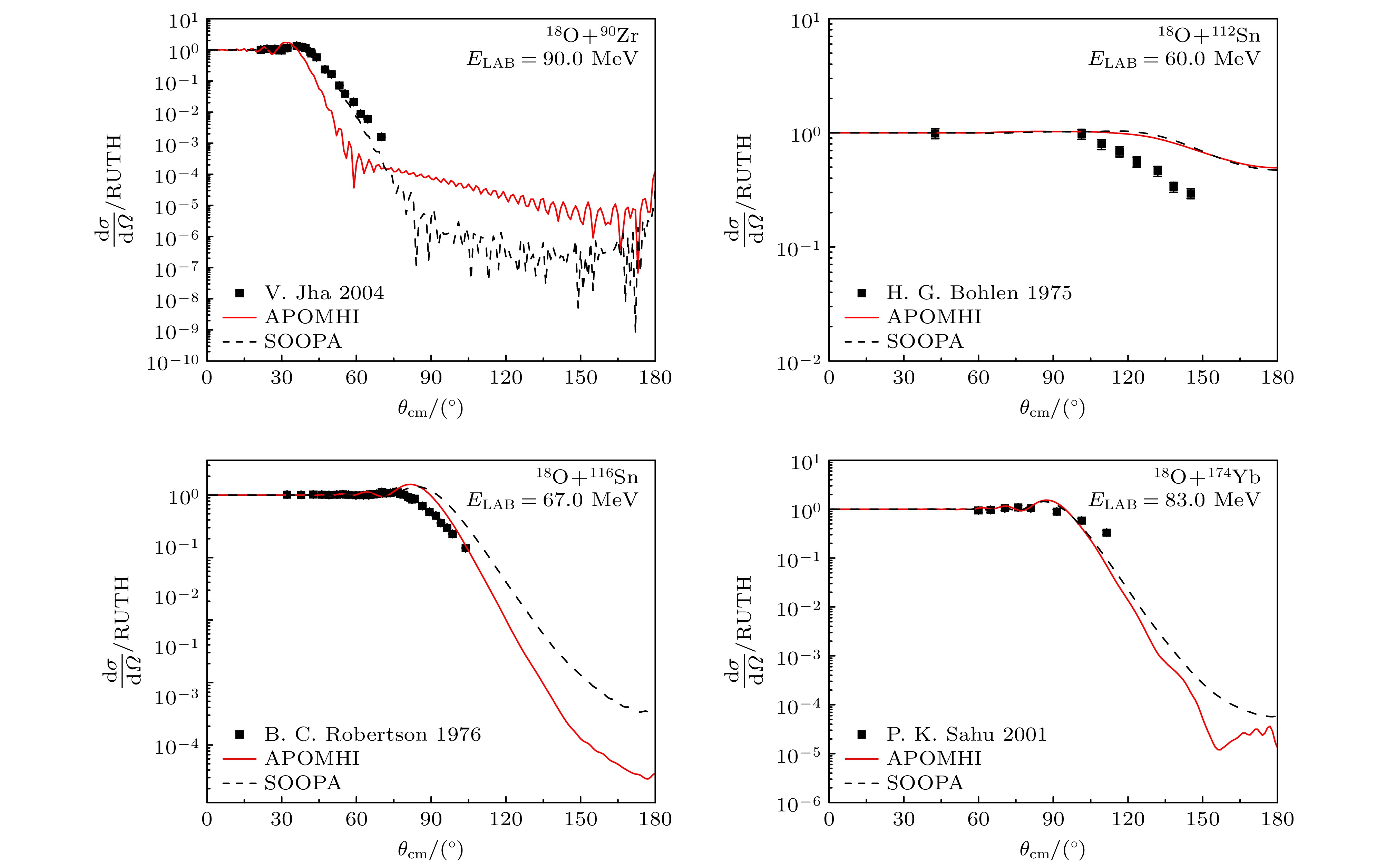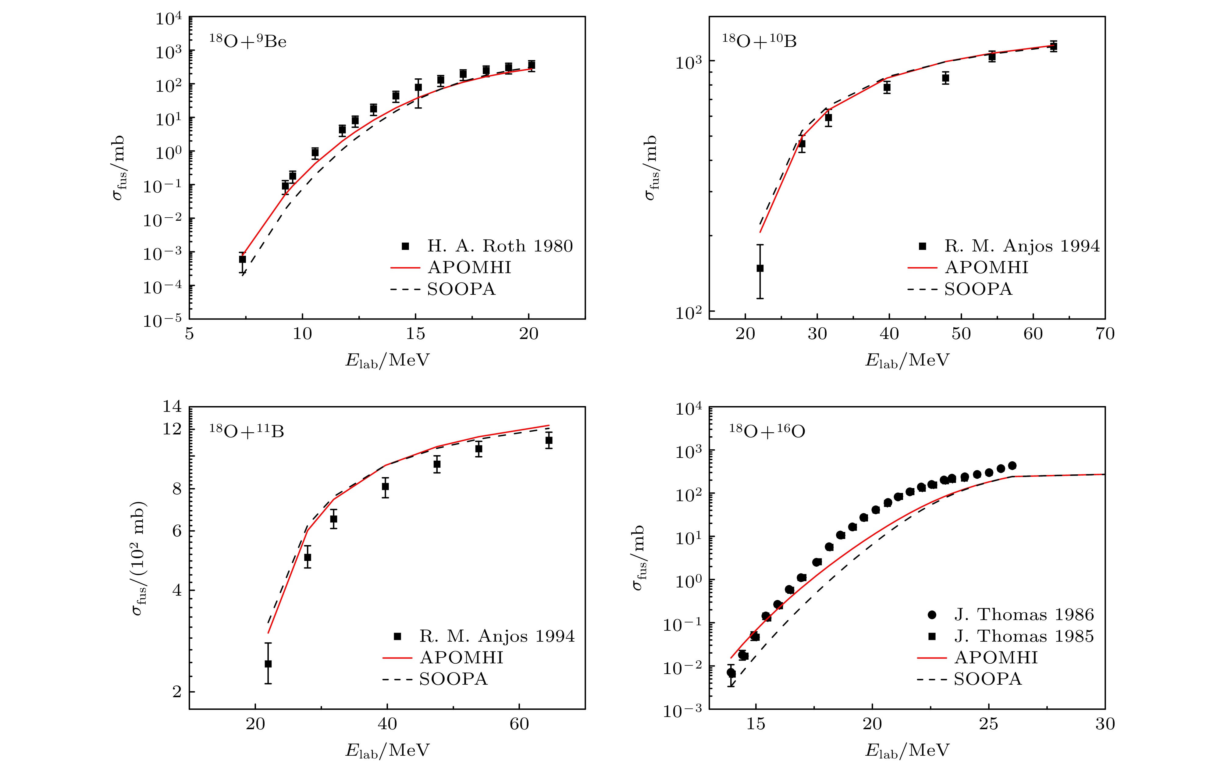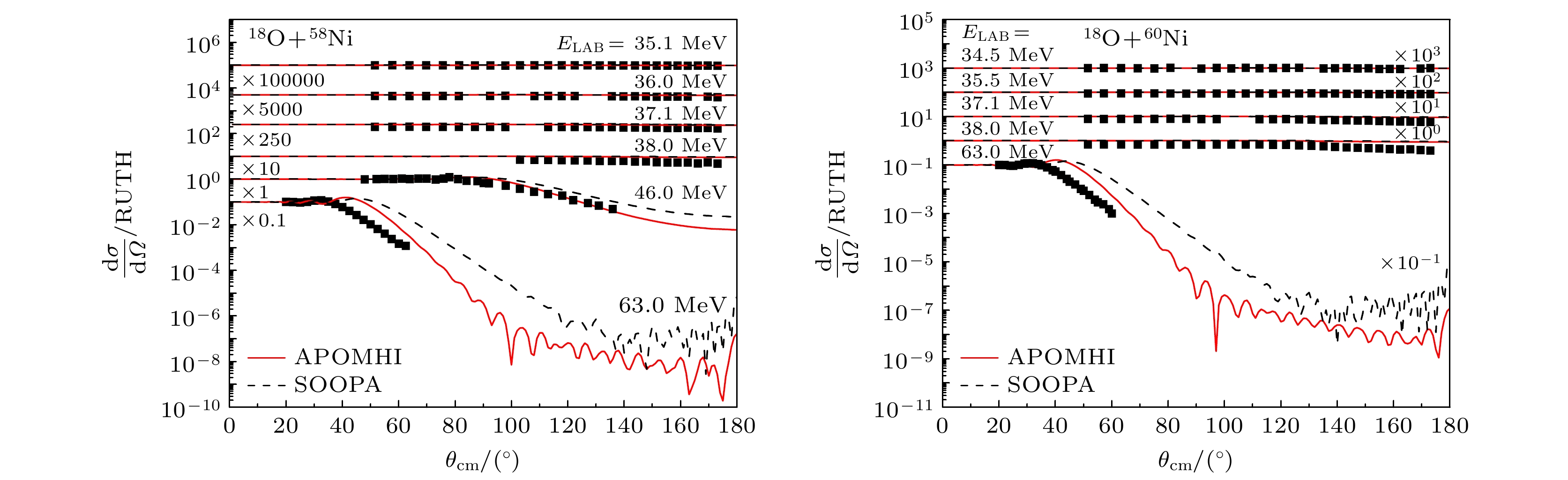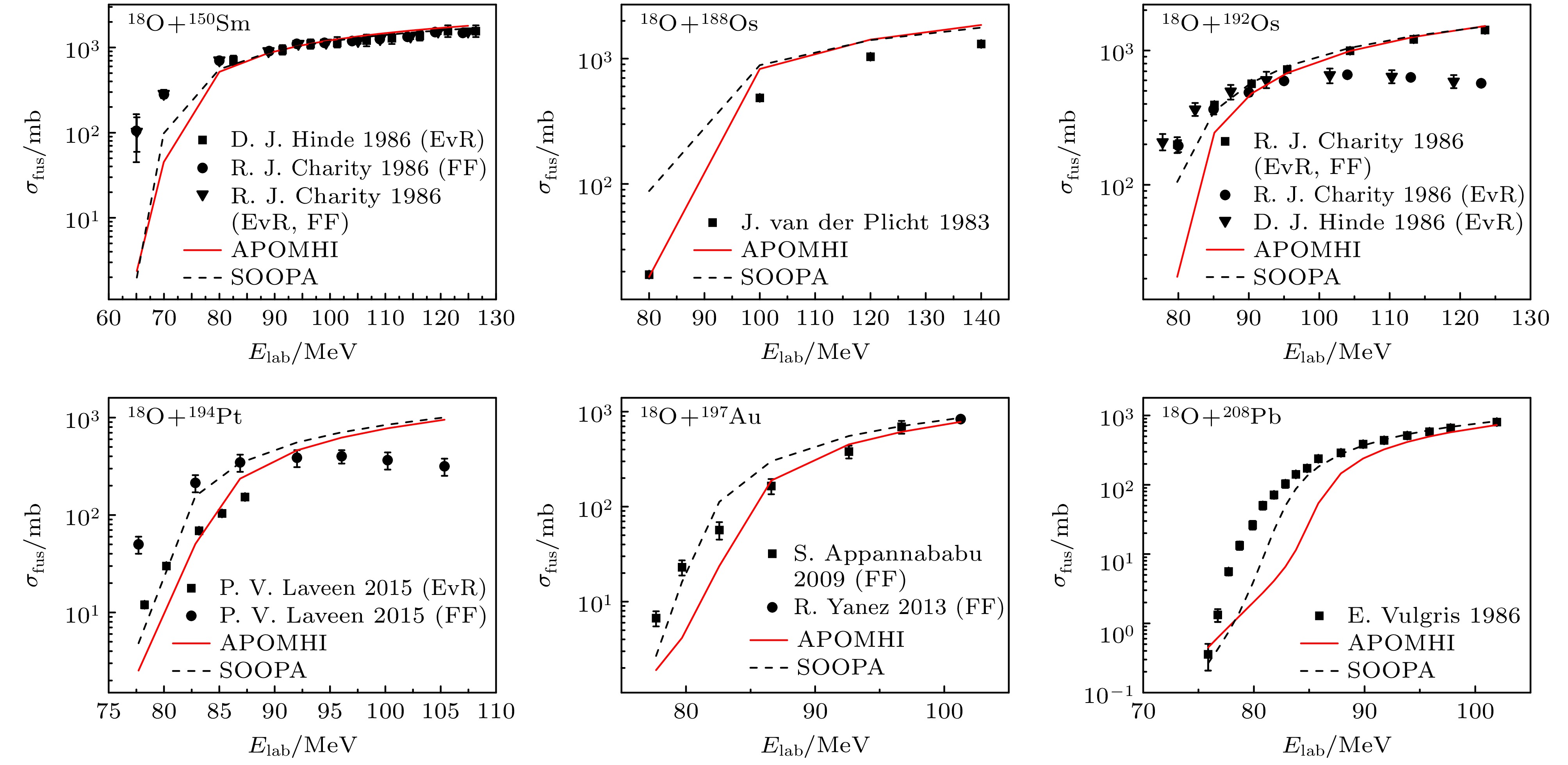APOMHI依然假设弹靶为球形核, 也不考虑两个核的激发态. 弹靶相差不大, 弹核可以轻于或重于靶核, 但二者不能为全同粒子. 利用该光学模型, 可以计算重离子碰撞的弹性散射角分布以及复合核吸收截面. 为验证APOMHI的适用性, 本文进一步以18O作为弹核的系列重离子碰撞反应为例, 通过拟合实验数据, 获取了相应反应的普适光学势. 同时, 作为比较, 本文也利用SOOPA在同样实验数据的基础上做了类似的计算.