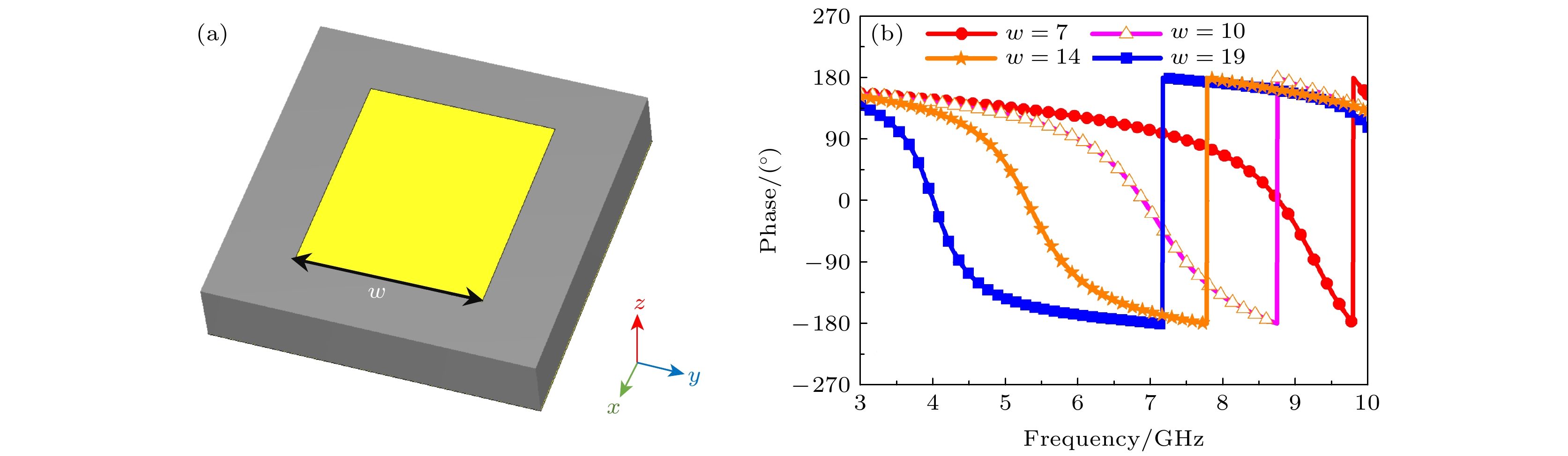 • 图 1  矩形贴片超表面单元 (a) 单元侧视图; (b) 单元不同金属贴片尺寸的反射相位
