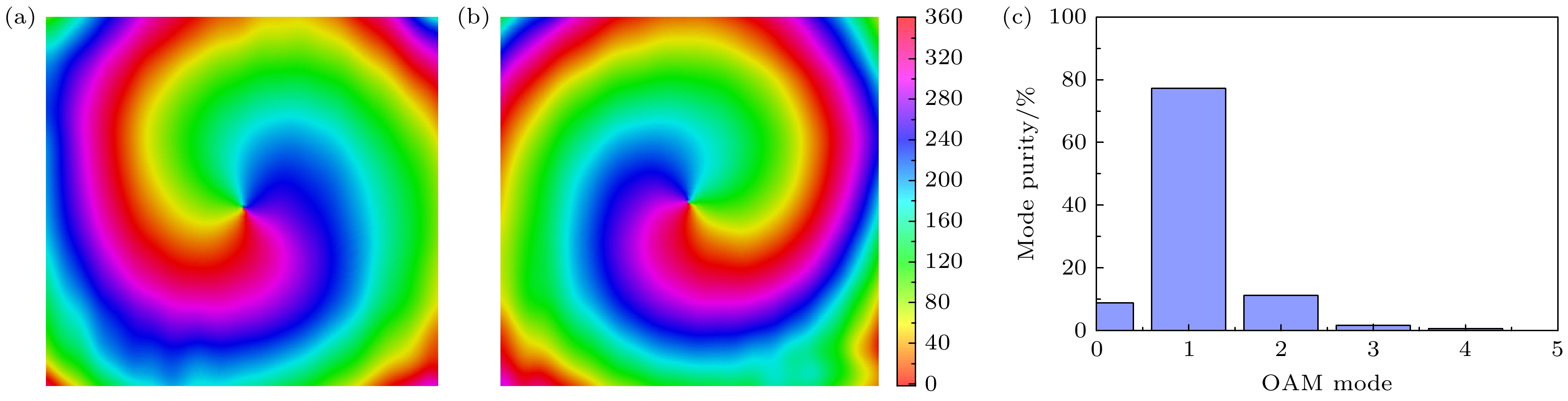 图 11  超表面在6.9 GHz处OAM散射波束俯仰角θ = 30°时的相位分布及模式纯度分析 (a) l = 1的相位分布; (b) l = –1的相位分布; (c) l = 1的模式纯度