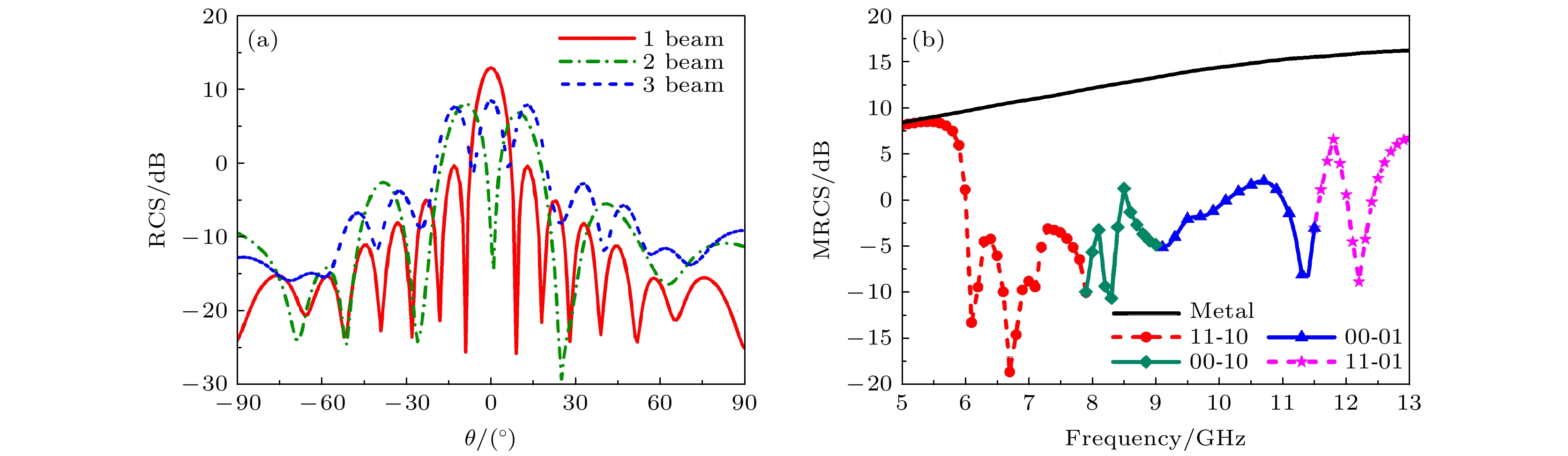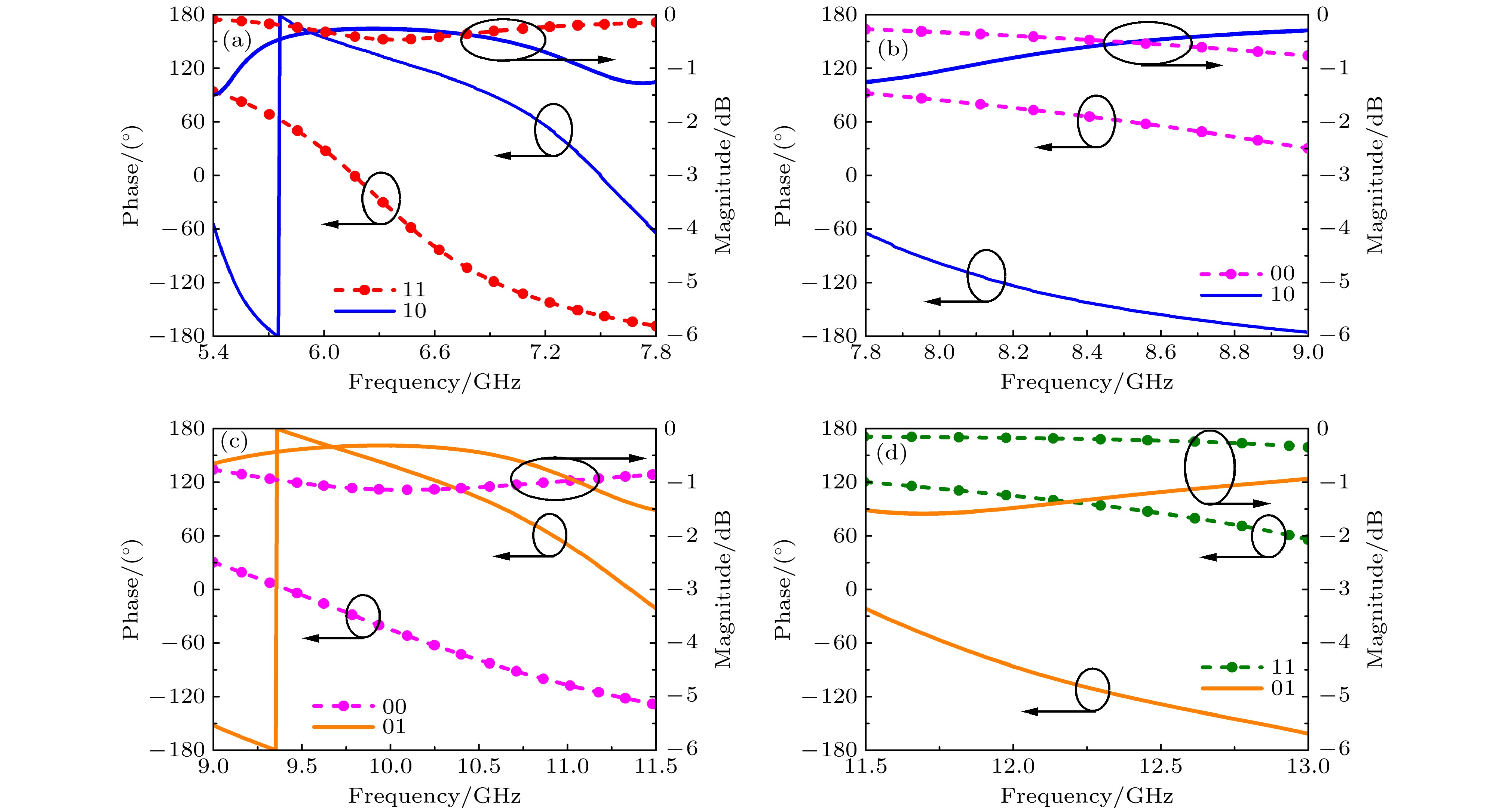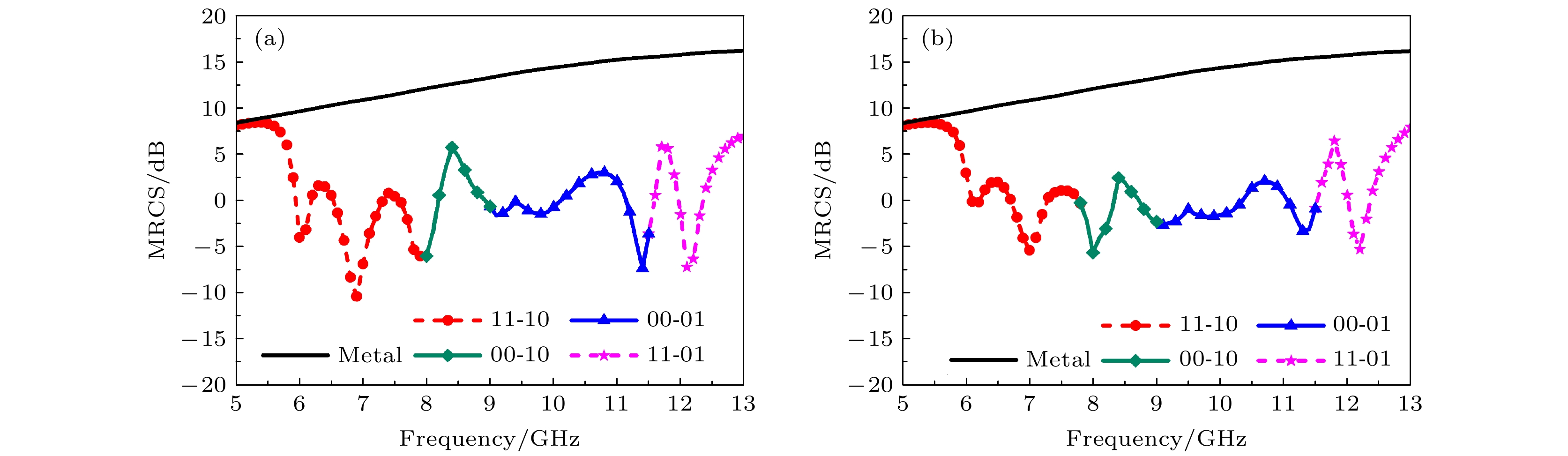 针对低RCS的设计目标, 当反射相位差满足180° ± 37°且幅度全反射时, 超表面相对金属板的RCS减缩量达到10 dB[37], 本文以RCS减缩10 dB为目标, 确定相移超表面单元的工作频段. 当y极化波垂直入射到图3中的单元时, 单元的反射性能如图6所示. 单元的两个PIN二极管状态编码定义为PIN-2和PIN-1都截止为编码“00”; PIN-2截止、PIN-1导通为编码“01”; PIN-2导通、PIN-1截止为编码“10”; PIN-2和PIN-1都导通为编码“11”. 从图6(a)可以看出, 单元的“11”和“10”两种状态在5.4—7.8 GHz频带内的相位差满足180° ± 37°, 反射幅度大于–2 dB; 在图6(b)所示的7.8—9.0 GHz频带内, 单元的“00”和“10”两种状态的相位差满足180° ± 37°, 反射幅度大致在–1 dB以内; 在图6(c)所示的9.0—11.5 GHz频带内, 单元的“00”和“01”两种状态的相位差满足180° ± 37°, 反射幅度大于–2 dB; 在图6(d)所示的11.5—13.0 GHz频带内, 单元的“11”和“01”两种状态的相位差满足180° ± 37°, 反射幅度大于–2 dB. 因此, 超表面单元结构不变的情况下, 仅通过FPGA控制2个PIN二极管的导通/截止状态, 即可在4个频带内产生1比特反射相位, 具备频率可重构和相位可重构功能.